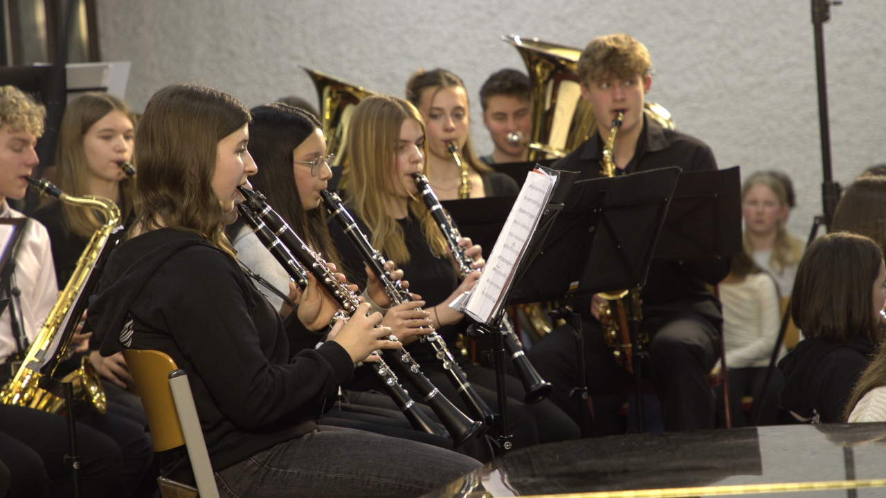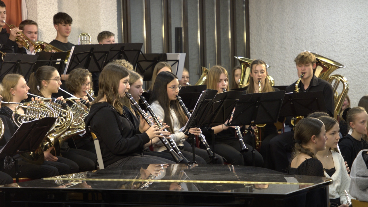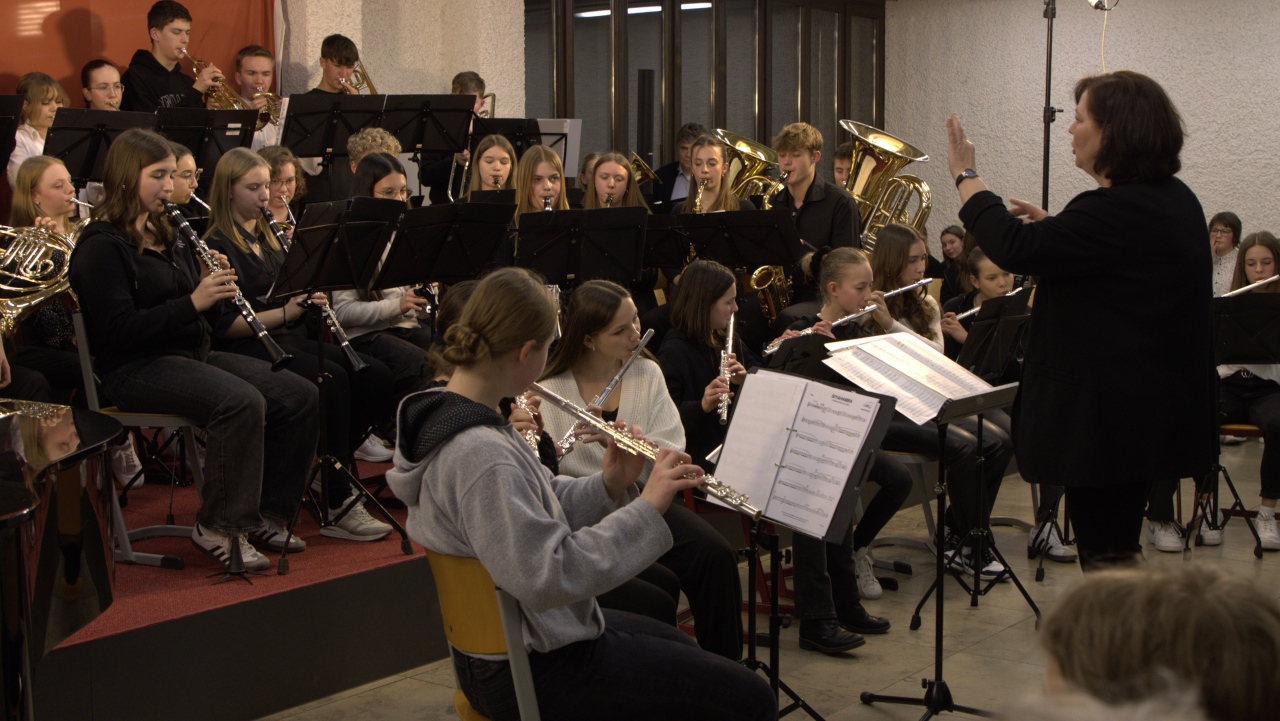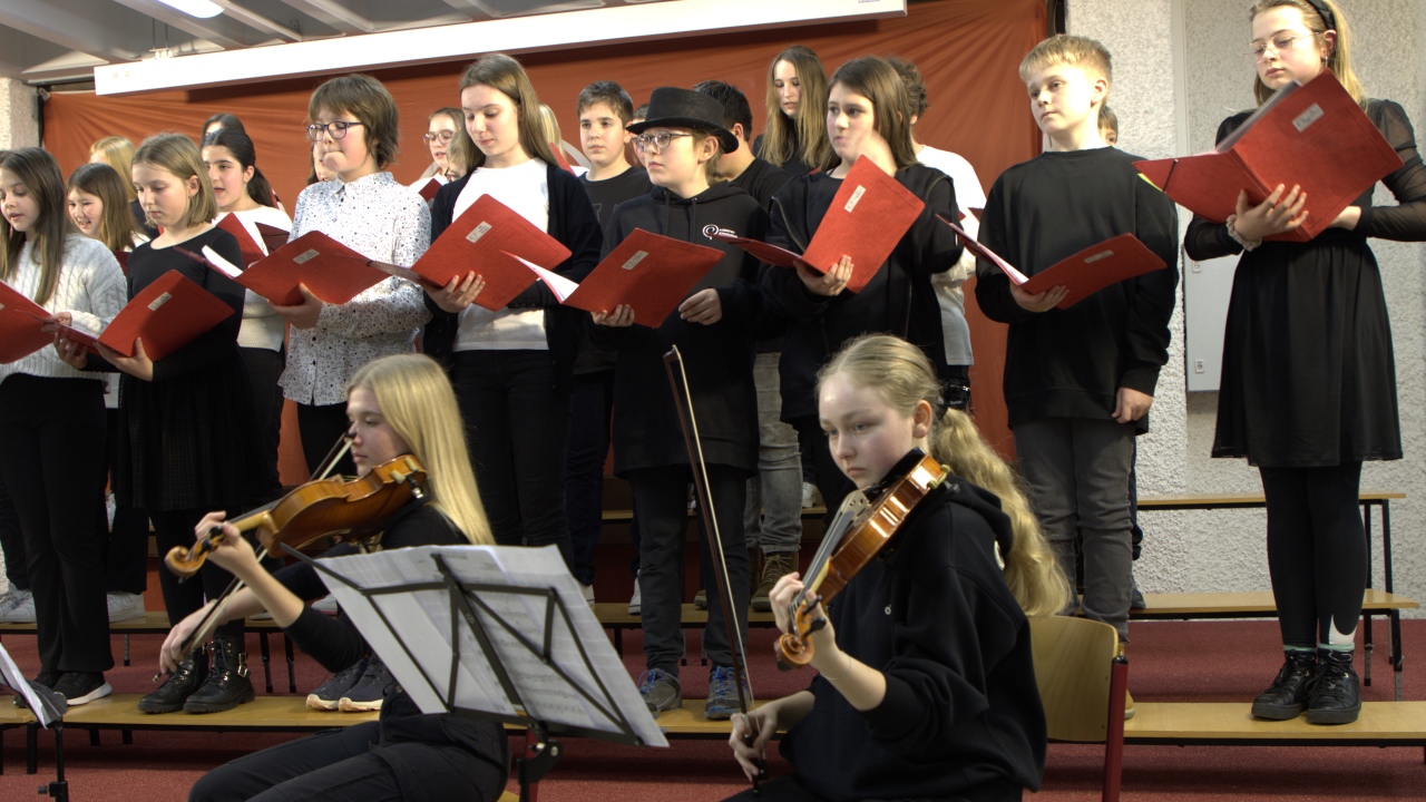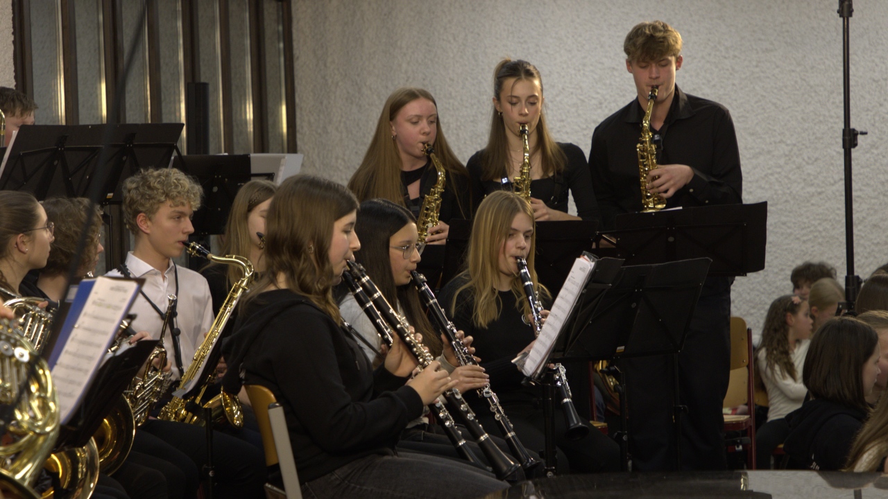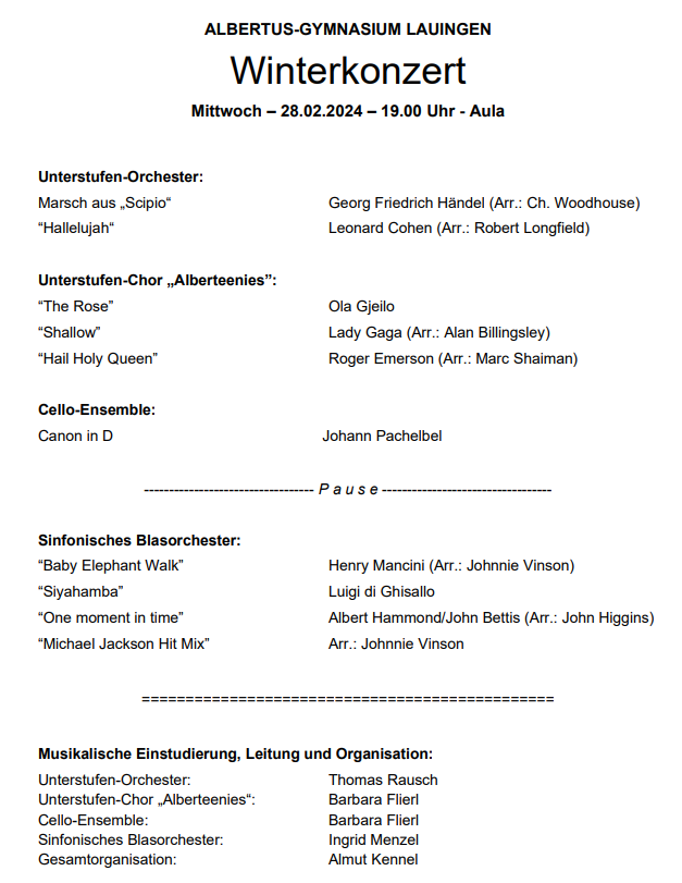 Das Winterkonzert des Albertus-Gymnasiums Lauingen lockte am 28.02.2024 zahlreiche Besucher in die Aula. Das Unterstufen-Orchester (Leitung: Thomas Rausch) eröffnete den musikalischen Reigen mit festlicher Barockmusik und stimmungsvollen Popklängen. Der Unterstufen-Chor „Alberteenies“ (Leitung: Barbara Flierl) meisterte anspruchsvolle Arrangements moderner Popsongs, angereichert von einem wunderbaren Klaviersolo, und sang sich mit schönem Stimmklang sowie spürbarer Begeisterung in die Herzen der Zuhörer. Ein ungewöhnliches Ensemble von 11 Violoncelli trug den bekannten Pachelbel-Kanon mit sonorer Klangfülle vor. Zum Abschluss erfreute das Sinfonische Blasorchester (Leitung: Ingrid Menzel) in großer Besetzung mit fröhlicher Filmmusik, durch Gesangssolisten unterstützten afrikanischen Klängen und schwungvollen Klassikern der Rockmusik. Zwei Zugaben mit begeistert mitklatschendem Publikum rundeten den gelungenen Konzertabend ab.