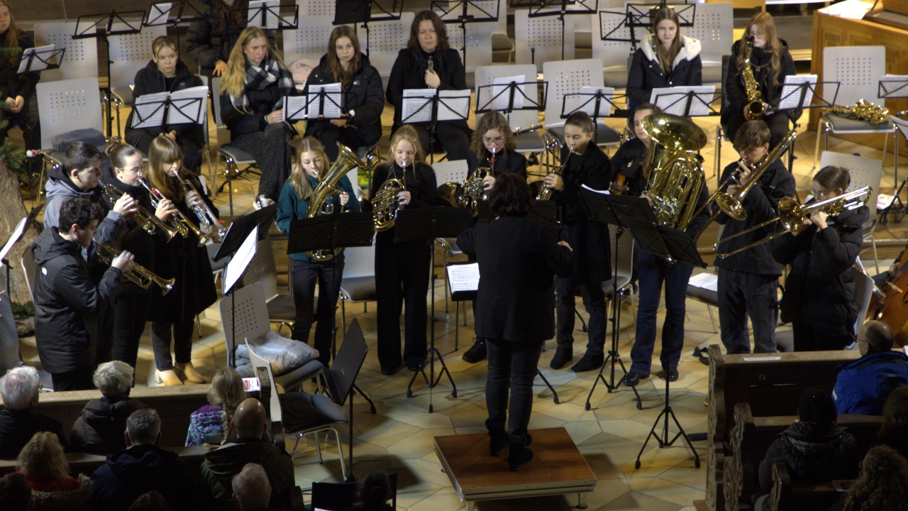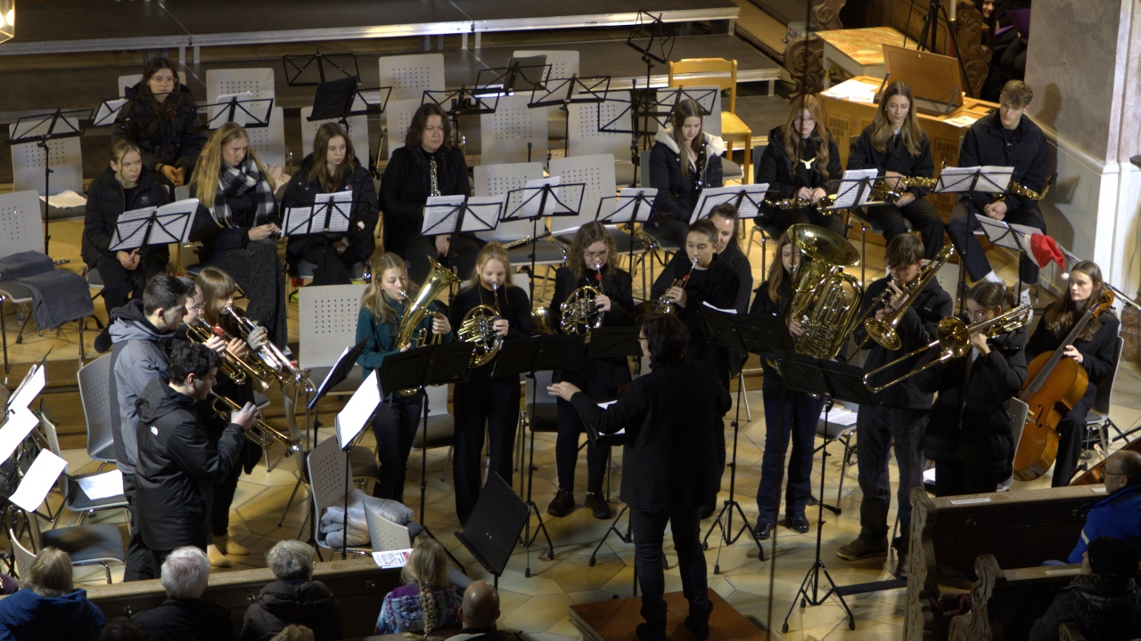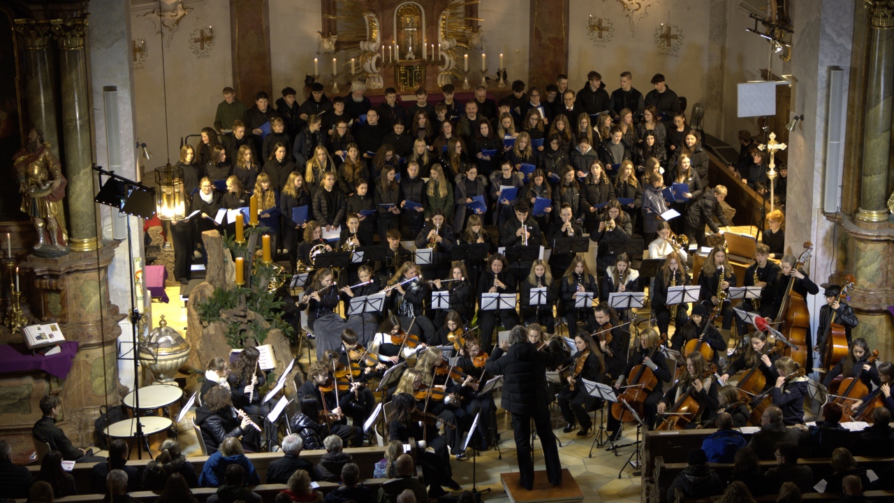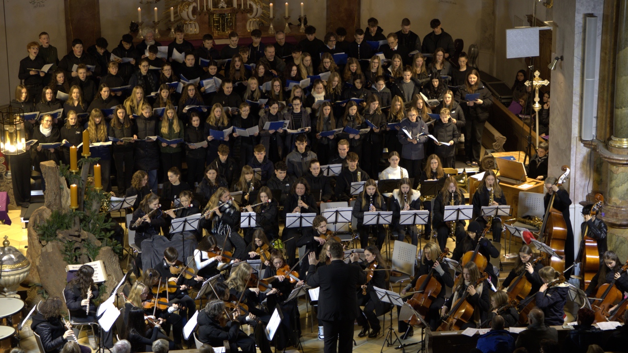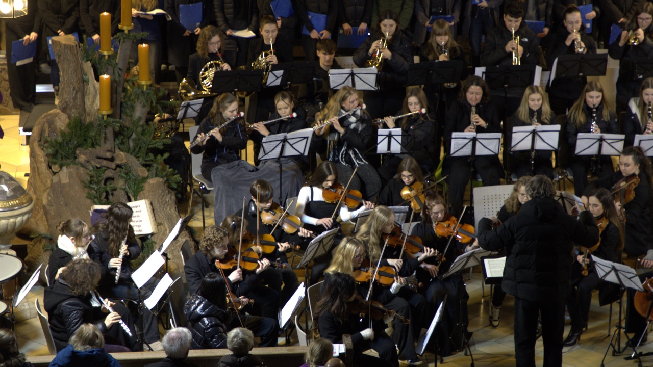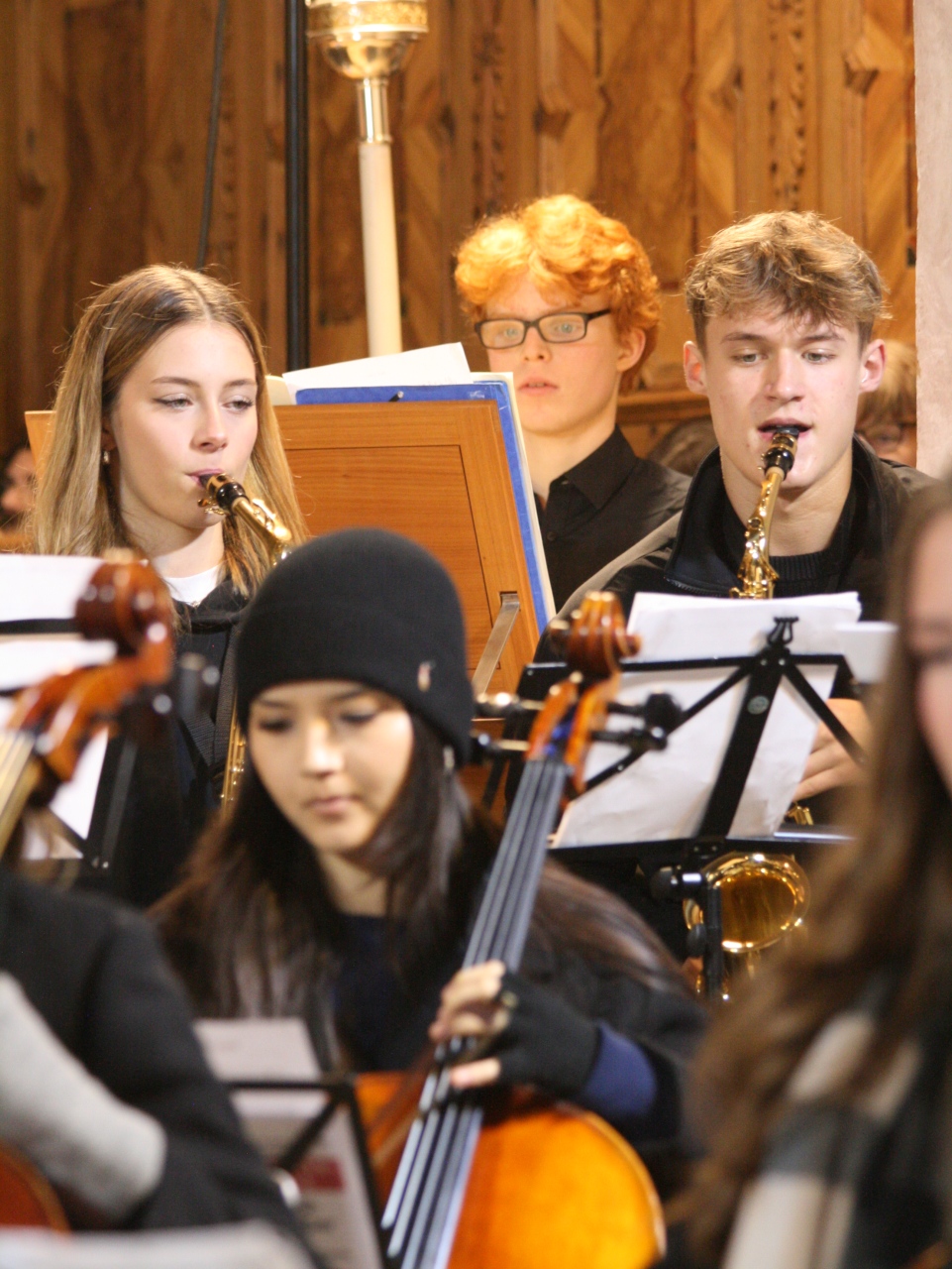 Mit Gesangssolisten (Vokalensemble Q12/G8 und G9), Mittelstufenchor (Verena Dopfer), großem Chor (Klaus Nürnberger), Bläserquintett (Ingrid Menzel) und großem Orchester (Thomas Rausch) stimmten über 160 Mitwirkende musikalisch auf das Weihnachtsfest ein.