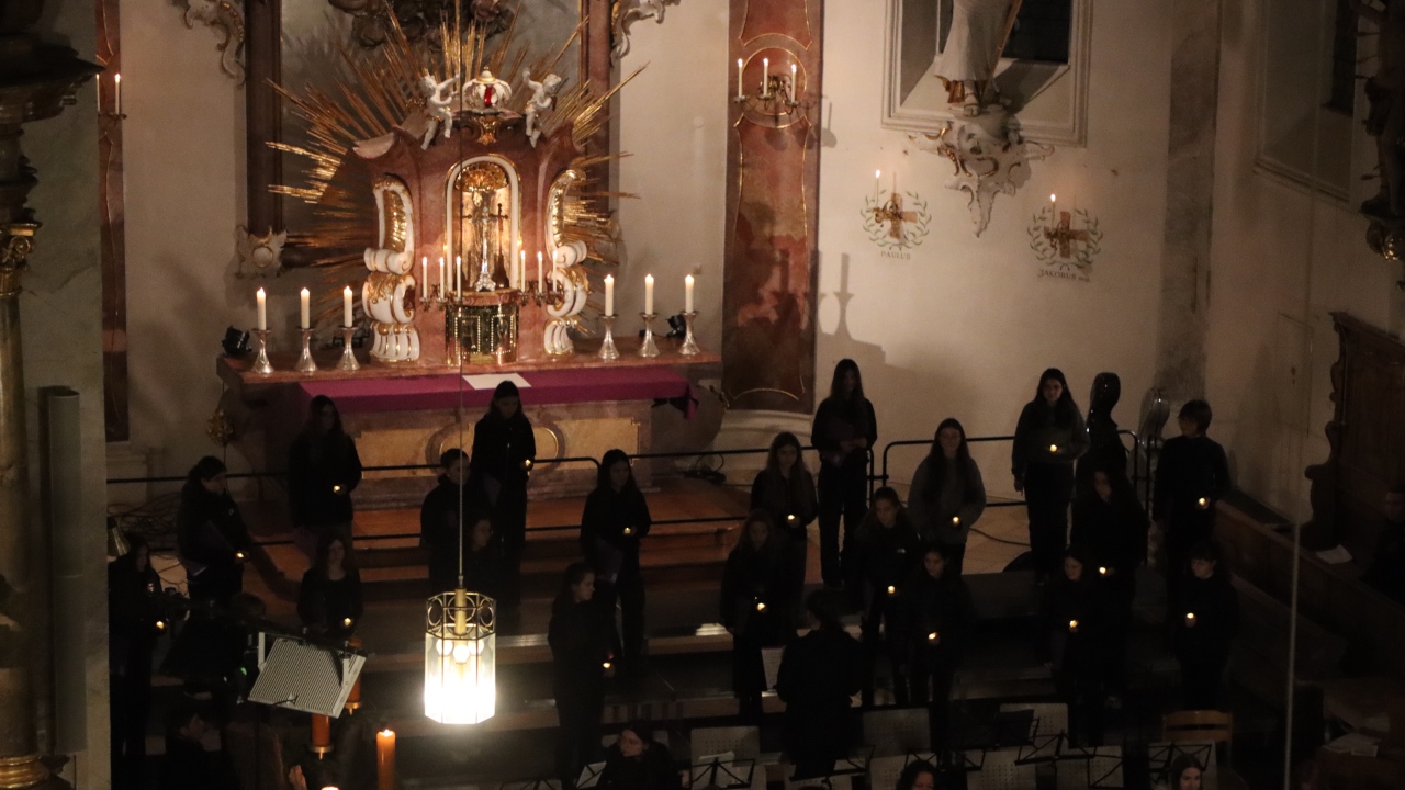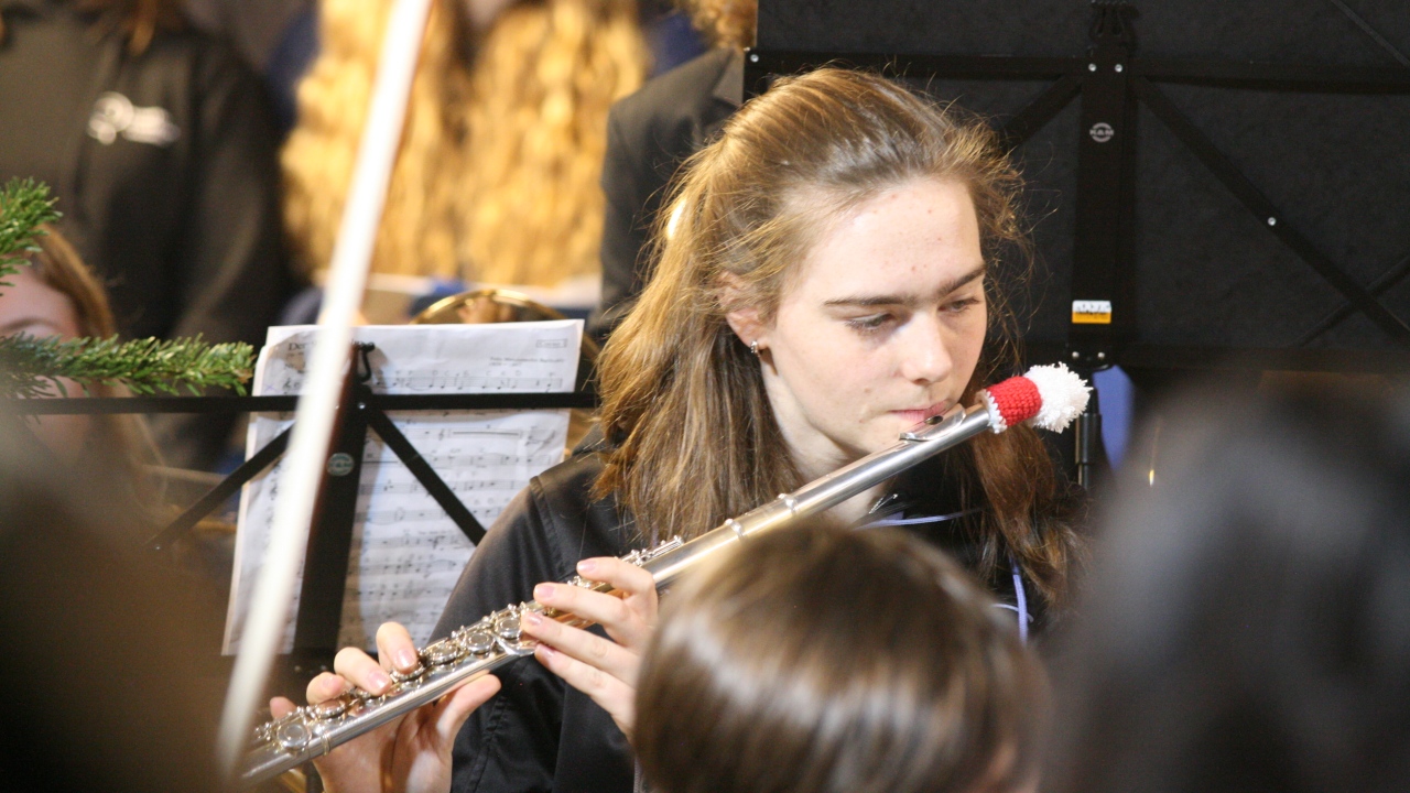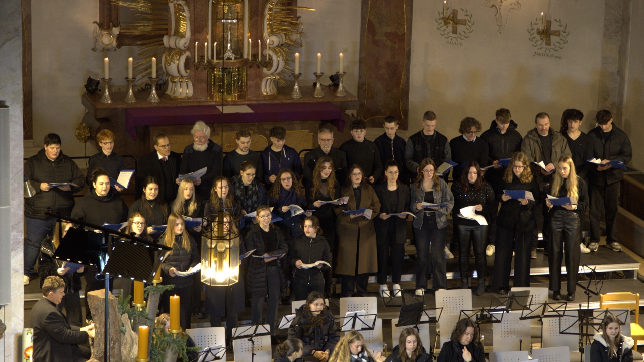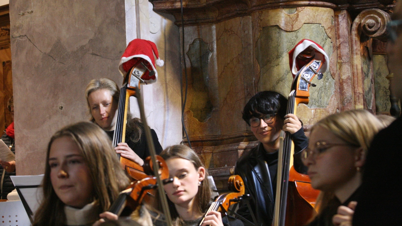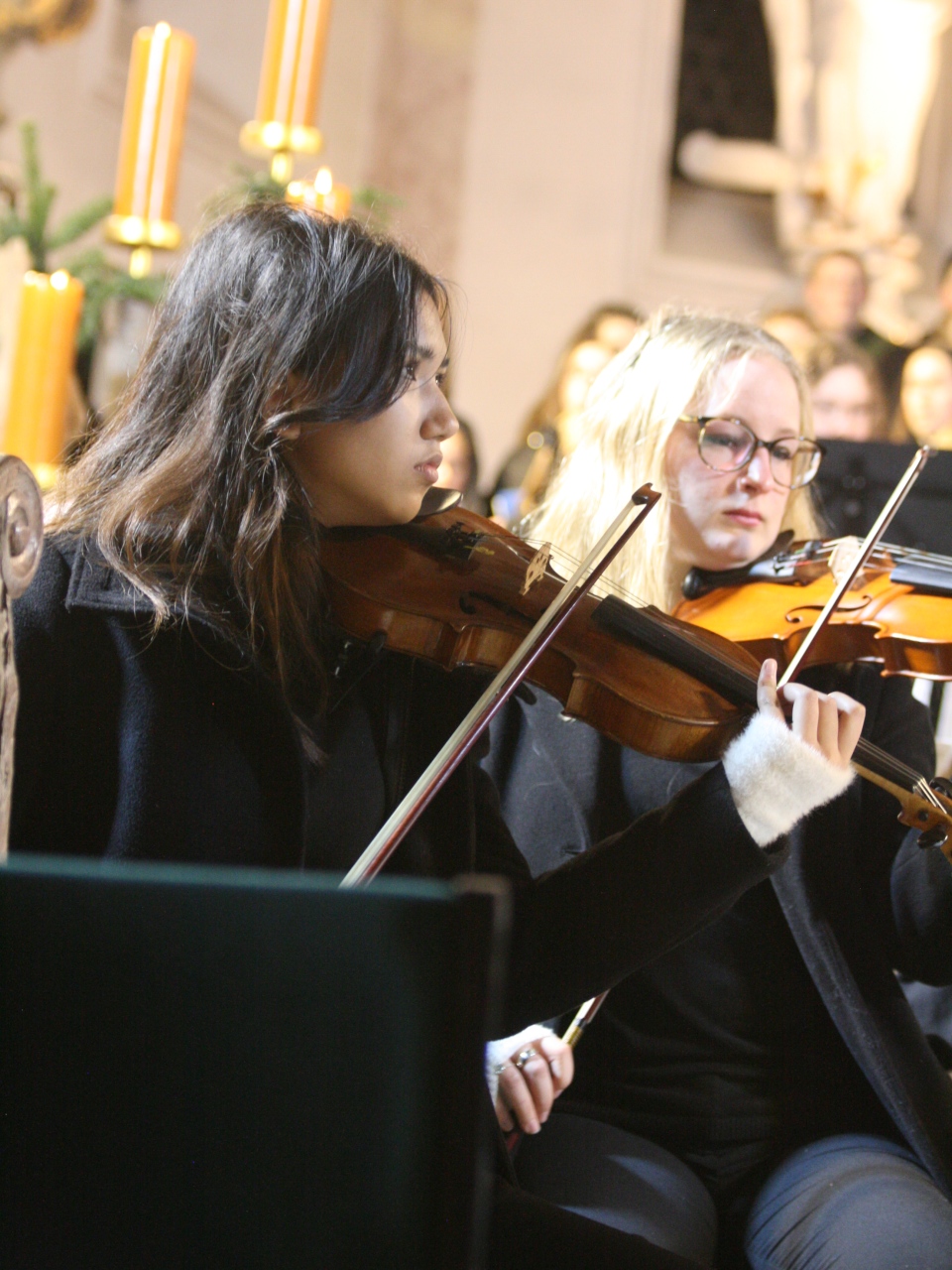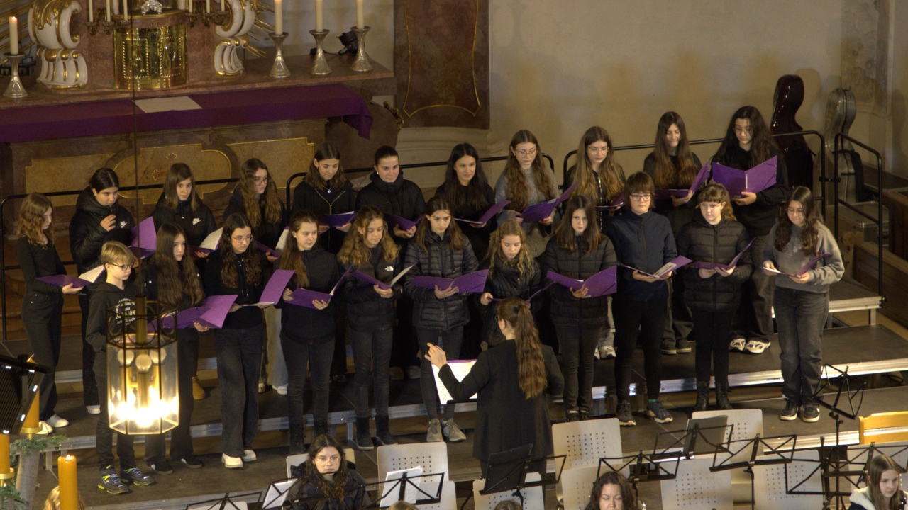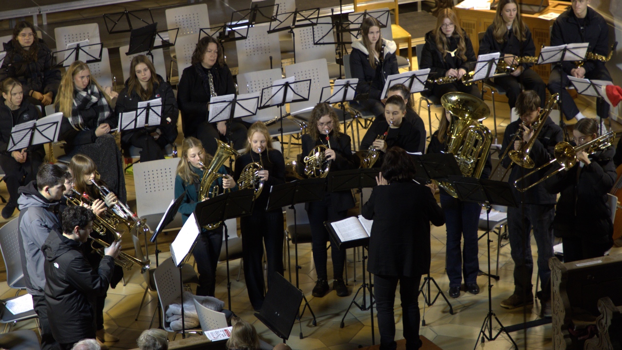 Mit Gesangssolisten (Vokalensemble Q12/G8 und G9), Mittelstufenchor (Verena Dopfer), großem Chor (Klaus Nürnberger), Bläserquintett (Ingrid Menzel) und großem Orchester (Thomas Rausch) stimmten über 160 Mitwirkende musikalisch auf das Weihnachtsfest ein.