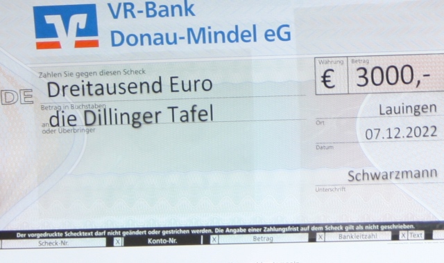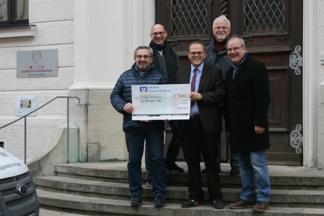Groß war die Freude bei den ehrenamtlichen hauptverantwortlichen Mitarbeitern der Dillinger Tafel, Alois Kleebaur und Eberhard Wirbka, als der Schulleiter des Albertus Gymnasiums in Lauingen, Jochen Schwarzmann, ihnen die gute Nachricht überbrachte, dass die Schüler/Innen des Arbeitskreises Solidarität unter Leitung von Rainer Bauer, der Tafel 3000,- € spenden, um dringend nötige Lebensmittel für die Schwächsten in unserem Landkreis zu besorgen.