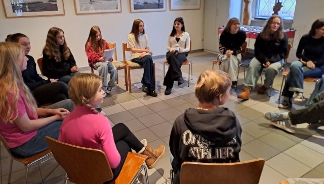 Mitte November war es endlich wieder so weit: Rund 20 Mitglieder der Theater-AG pilgerten an die Donau, wo sie zwar nicht ins Wasser, aber voll und ganz in ihr neues Stück ,,Friedas Traum oder Kann man aus der Geschichte lernen?“ eintauchen wollten. Die behaglichen Gemeinschaftsräume des Lauinger Ruderclubs erleichterten es ihnen, den Schulalltag abzustreifen und sich unter Anleitung von Frau Sienkiewicz und Herrn Frank mit dem anspruchsvollen Inhalt des Kriegsdramas auseinanderzusetzen.