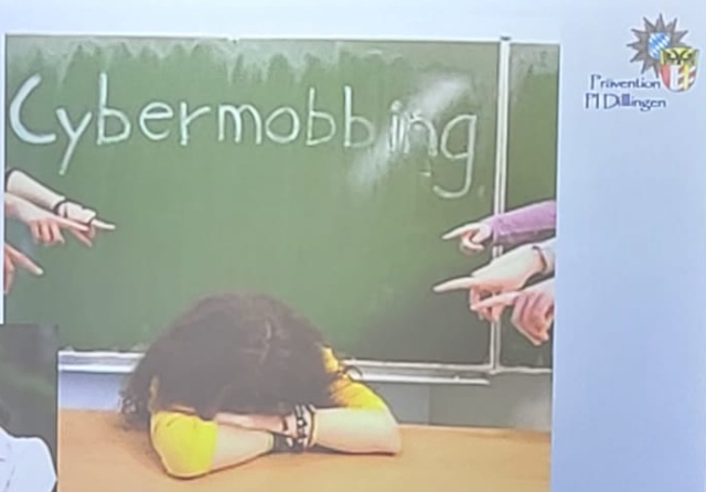 Im Rahmen von Prävention gegen Mobbing in der Schule und im Netz lud Rainer Bauer Polizeihauptmeisterin Monika Dessecker von der PI Dillingen ein, um unsere SchülerInnen professionell aufzuklären. Erstaunt war die Polizistin vom Vorwissen der Jugendlichen, die Fachbegriffe benennen und strafbare Taten treffsicher zuordnen konnten.