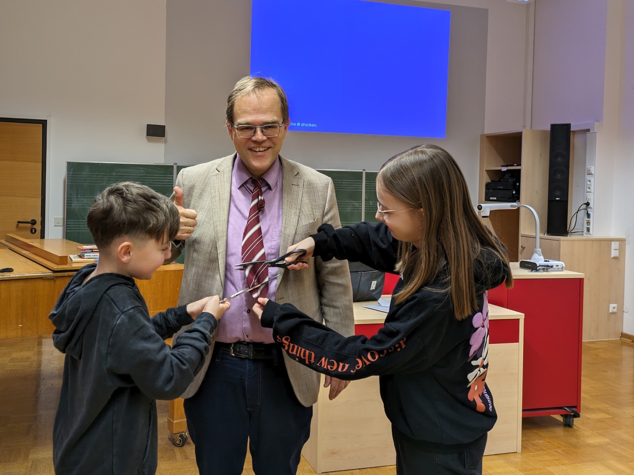 Gumpiger Donnerstag: Die Krawatte des Schulleiters Jochen Schwarzmann muss dran glauben. Er nimmt es - wie immer - mit Humor...