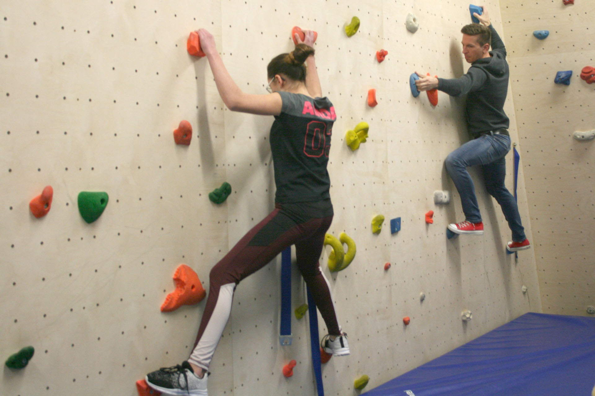 • Im Eingangsbereich der Sporthalle entstand eine Boulder-Kletterwand, deren Finanzierung der Förderverein mit einem Betrag von 3500 € zu großen Teilen übernommen hat.