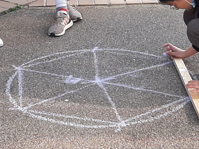 Ausgestattet mit Kreide, Schnur und Holzlatte konnte die 7b ihre Geometriekenntnisse im Pausenhof anwenden.