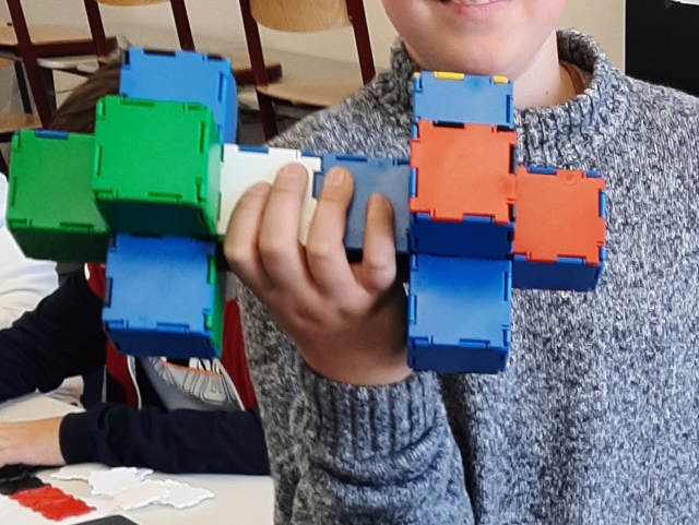 Um die Berechnungen an verschiedenen Körpern anschaulicher zu machen, bastelte die 5c in der Intensivierungsstunde mit den bunten Bauteilen aus dem "Mathespielzeug".