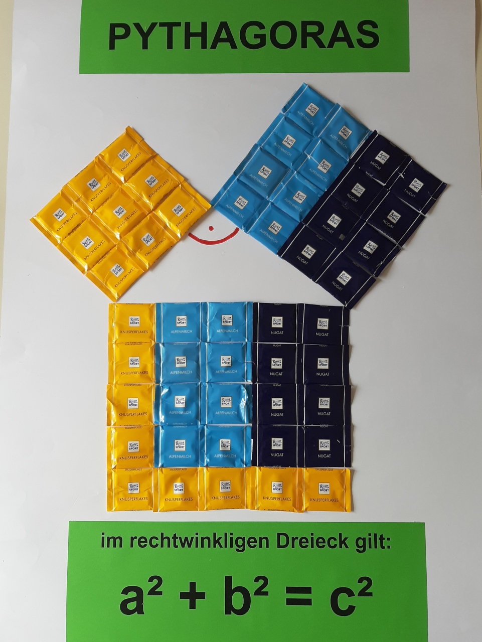 Als anschauliches Modell zum Satz von Pythagoras gestaltete die 9b ein Plakat mit kleinen Schokoladequadraten.
