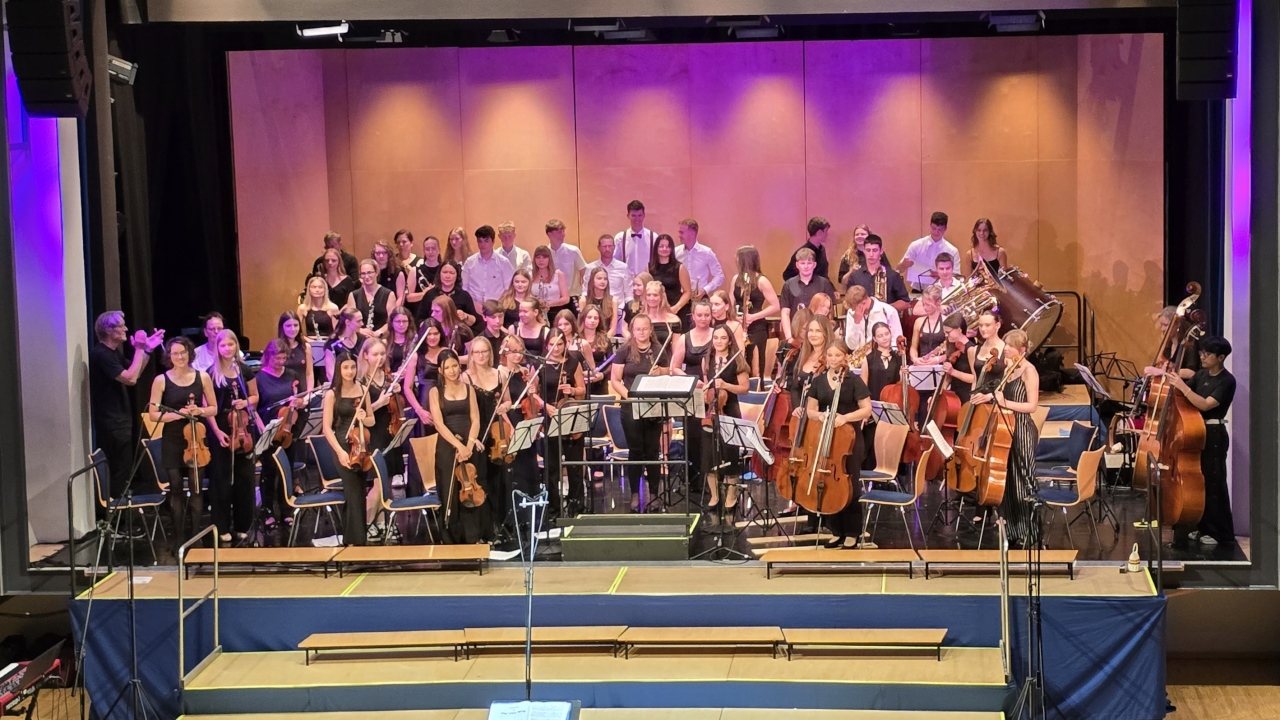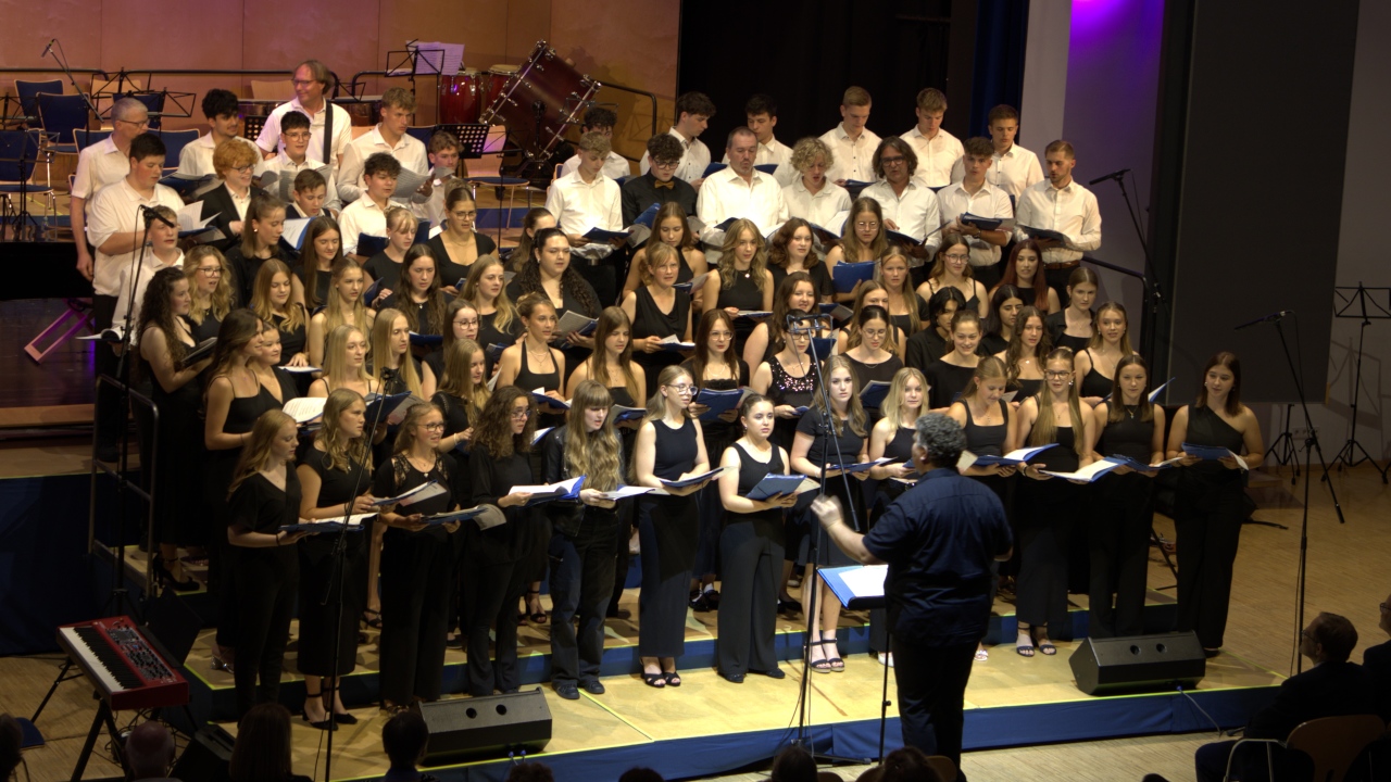 Die Leitungen der Ensembles (von links): Ingrid Menzel (Blechbläserensemble), Barbara Flierl (Unterstufenchor "Alberteenies"), Thomas Rausch (Großes Orchester), Verena Dopfer (Mittelstufenchor), Klaus Nürnberger (Großer Chor "Al Cantus", Vokalensemble), Schulleiter Jochen Schwarzmann