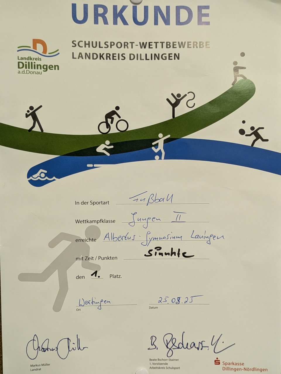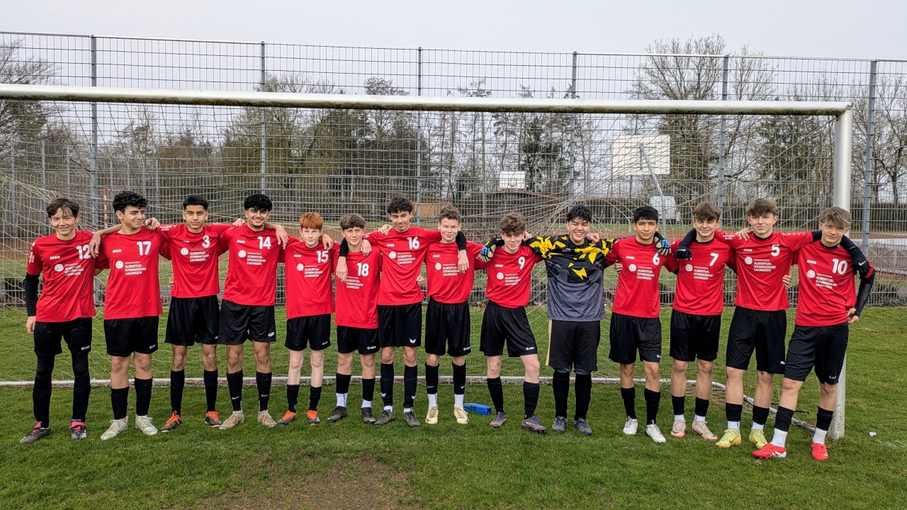 Auch in diesem Schuljahr nahm das Albertus-Gymnasium im Rahmen des Wahlkurses Fußball am Wettbewerb Jugend trainiert für Olympia teil. Die vom Sportlehrer Matthias Lanninger betreuten Jungs der Wettkampfklasse II (Jahrgang 2009-2011) traten dabei in Wertingen nach dem Modus „Jeder gegen Jeden“ zuerst gegen die Donau-Realschule Lauingen an. Am Ende der regulären Spielzeit trennte man sich leistungsgerecht 0:0. Auch das nächste Spiel gegen die Realschule Wertingen ging aufgrund einiger vergebener Chancen torlos zu Ende. Im letzten Spiel gegen die Mittelschule Wertingen musste somit ein Sieg her. Nach dem die Partie torlos in die Halbzeit ging, warfen die Schüler des AGL in der zweiten Halbzeit alles nach vorne. Daraufhin überschlugen sich die Ereignisse. Zuerst wurde dem AGL ein Elfmeter zugesprochen, der nach längerer Diskussion des Schiedsrichters mit den Spielern im Anschluss wieder zurückgenommen wurde. Es folgten zahlreiche vergebene Chancen für die Jungs des Albertus-Gymnasiums. Eine Ecke als letzte Aktion des Spiels brachte dann letztendlich doch noch den verdienten Siegtreffer zum 1:0 Endstand. Mit diesen Resultaten und 5 Punkten reichte es somit am Ende zum verdienten 1. Platz und damit für die Qualifikation zum Regionalentscheid.