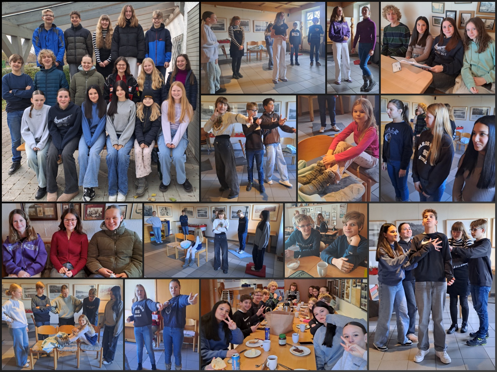 Doch obgleich die Gruppe mit mannigfaltigen Schwierigkeiten konfrontiert wurde, gab es während der Szenenproben viel zu lachen. Wenn tatsächlich einmal Textunsicherheiten auftraten, griff die versierte Souffleuse sofort unterstützend ein. Auch beim gemeinsamen Frühstücken, Aufwärmen, Diskutieren, Üben, Puzzlen, Kochen, Mittagessen, Aufräumen, Plaudern, Teetrinken und Spielen blieb die Stimmung stets heiter. Trotz der erheblichen Altersunterschiede (in diesem Schuljahr schließt die Theater-AG Schülerinnen und Schüler von der fünften bis zur zehnten Jahrgangsstufe ein) sind sich alle Anwesenden respektvoll, hilfsbereit und freundschaftlich begegnet. Dadurch herrschte auf den Theatertagen - ganz im Gegensatz zum düsteren und zerstörerischen Gehalt des Stücks - eine ausgesprochen harmonische und produktive Atmosphäre.