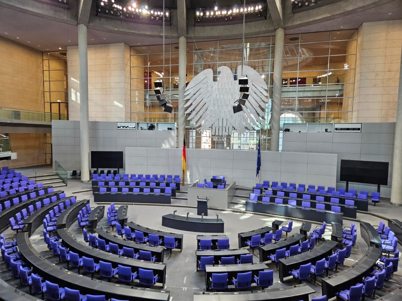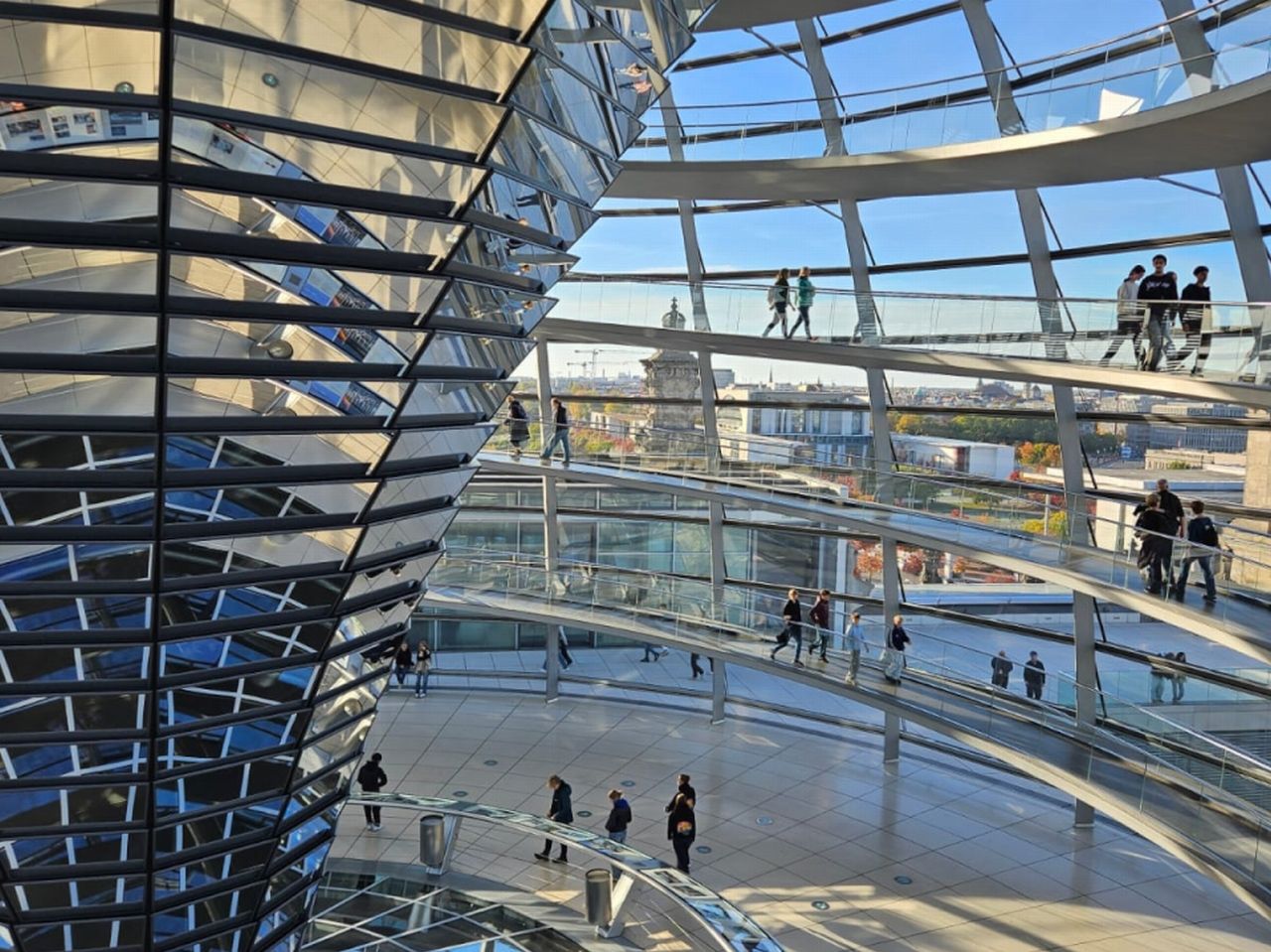 Gestärkt ging es nachmittags zum Reichstag, wo wir Näheres über den Ort der großen deutschen Politik lernen wollten. Leider waren die Verhältnisse auch dort ungewohnt berlinerisch... äh chaotisch, sodass es ein ständiges Hin und Her und Rauf und Runter wurde bis wir endlich auf der Besuchertribüne (sogar auf der Ehrentribüne!) des Plenarsaals saßen, streng bewacht von der 'fetten Henne' - dem Bundesadler. Der Informationsvortrag entpuppte sich als sehr gut und kurzweilig, sodass wir wesentlich klüger und gut unterhalten den Weg zurück auf die Kuppel antreten konnten, von wo aus wir bei dem herrlichen Wetter einen tollen Blick über Berlin in Herbstfarben hatten und sicherlich viele Erinnerungsfotos geschossen wurden.