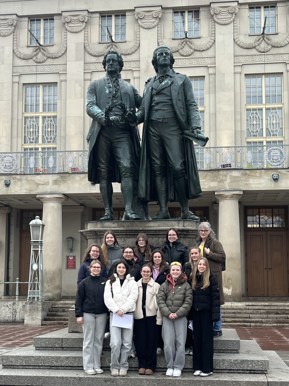 Mit fröhlichen Elftklässlerinnen starteten wir unsere Bildungsfahrt nach Weimar – allerdings mit Hindernissen: Wegen großer Zugverspätung verpassten wir unseren Anschluss und strandeten zunächst in Donauwörth. Am Nachmittag erreichten wir schließlich doch unser Ziel.