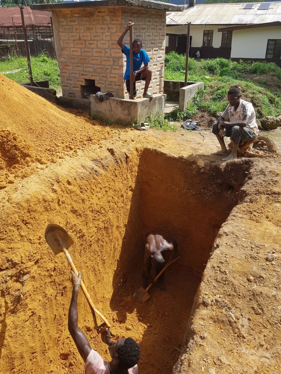 Zuerst wurde eine Doppelabfallgrube gegraben: 1,5 m breit und 3,5 m lang und 2,2 m tief(!) – Dazu wurden von den beiden Männern, die für den Compound und die Außenanlagen zuständig sind, innerhalb von drei Tagen über 11 Kubikmeter Erde herausgeschaufelt. Eine absolut krasse Leistung.