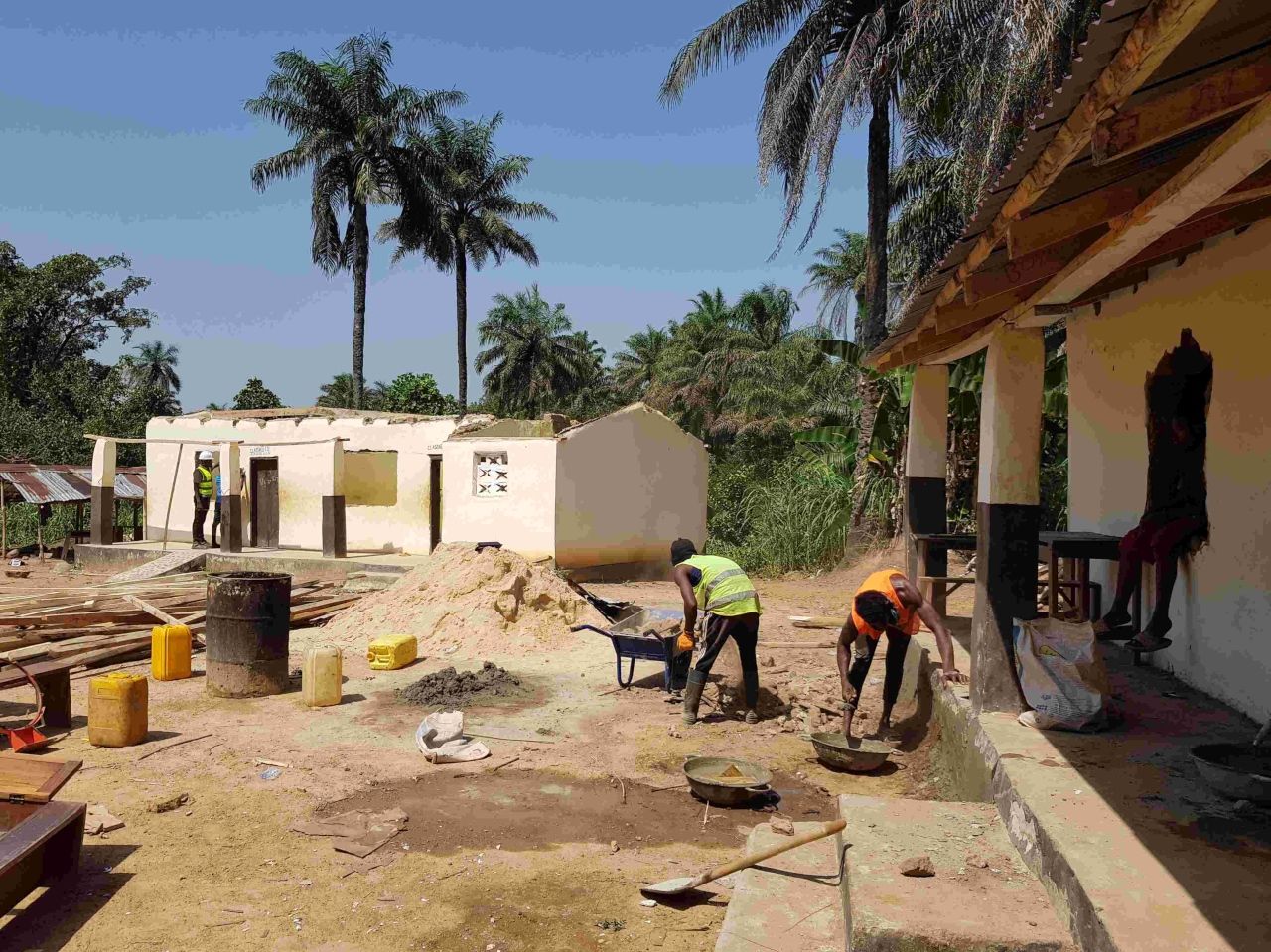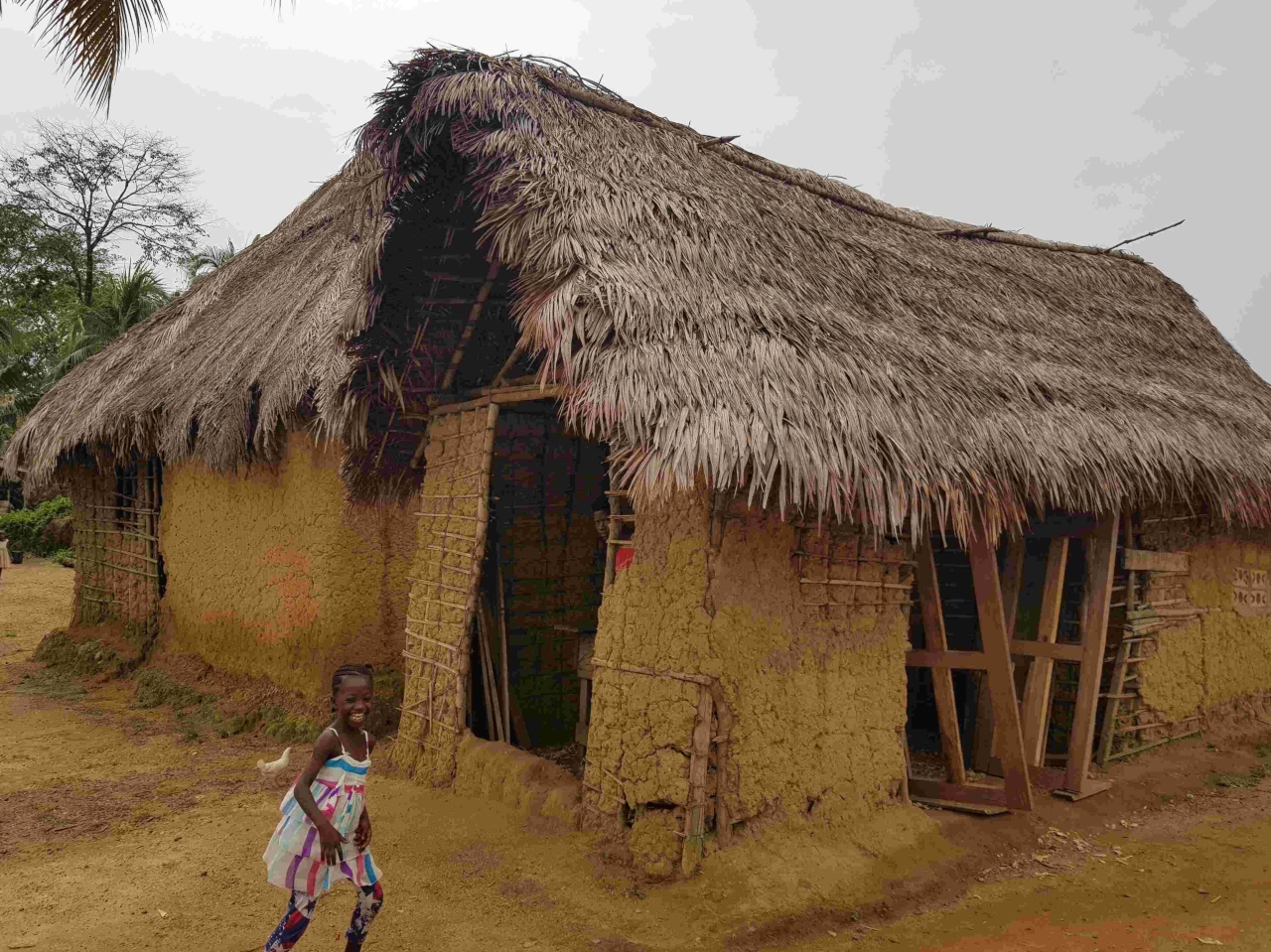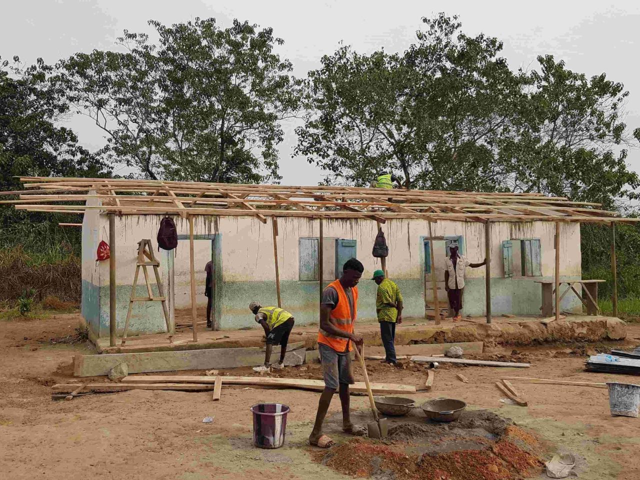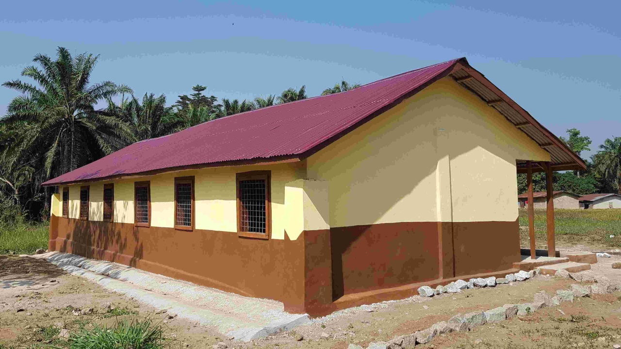 Die beiden Schulgebäude konnten wir zusammen mit den Helfern aus dem Dorf vor Weihnachten fertigstellen. Was für eine Freude. Wir bekamen als Geschenk ein Huhn, eine große Yamswurzel und Kochbananen überreicht.