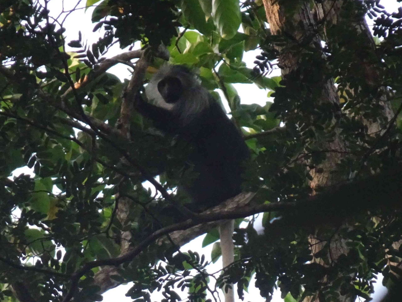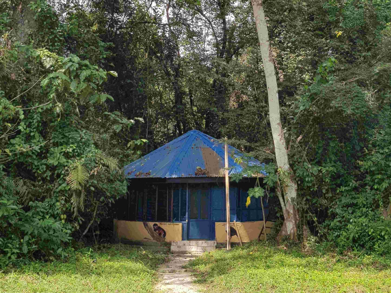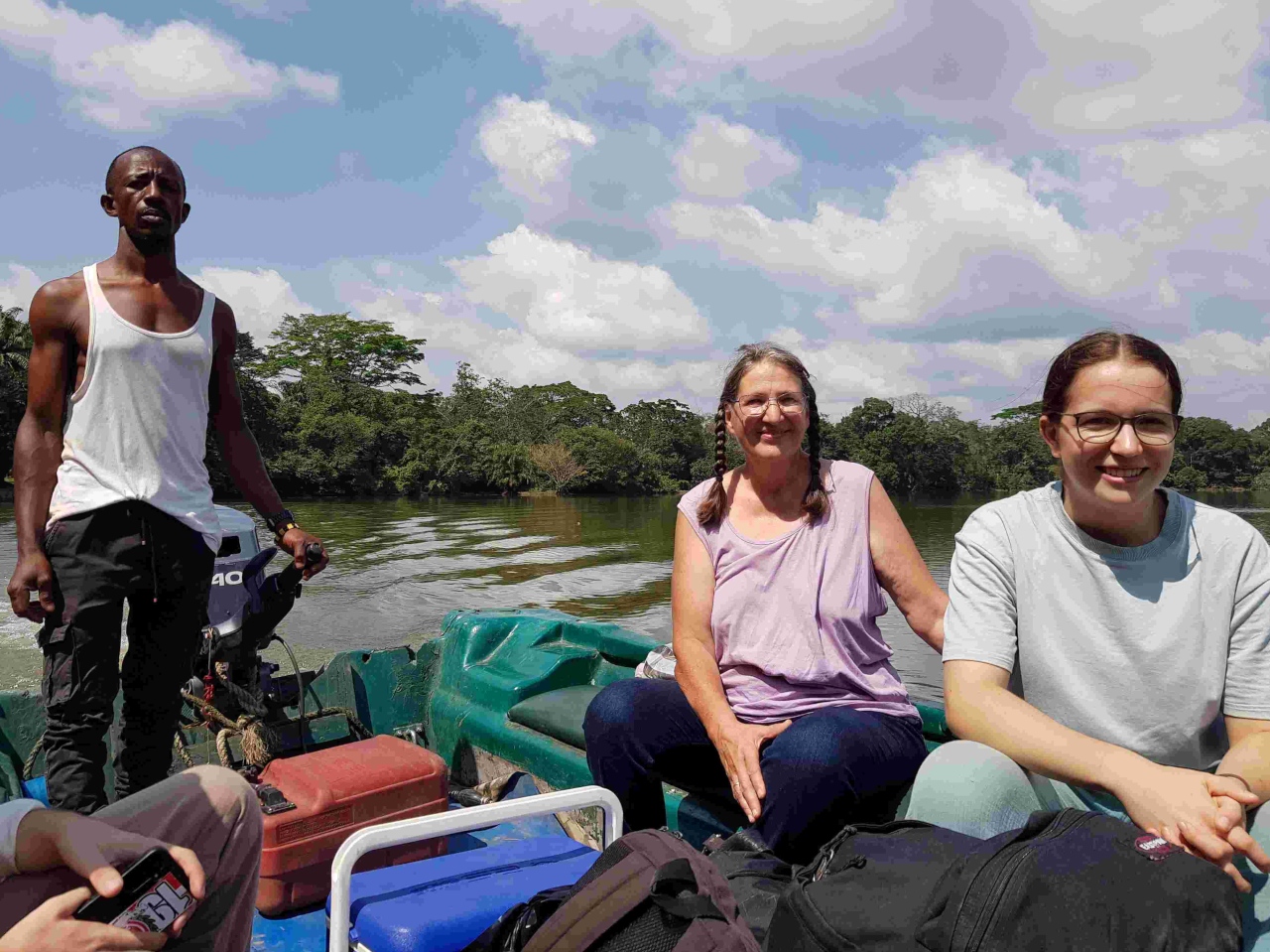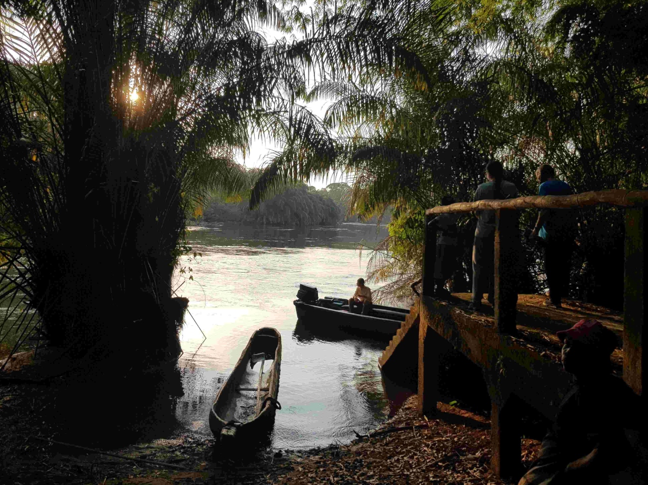 Die Tage danach waren wir zusammen mit den Voluntären Anna und Mael südlich von Bo auf einer Insel im Fluss Moa. Einem ganz besonderen Naturreservat. Dort haben wir im Camp übernachtet – offene Rundhütten mit Betten geschützt durch Moskitodraht. Mit den ganzen Geräuschen des Urwalds, bis hin zu schreienden Affen. Diese sind allerdings sehr scheu und man braucht oft viel Geduld die wirklich bestaunen zu können. Mir gelangen sogar einige Schnappschüsse der scheuen Tiere (black-and-white Colobus und red Colobus), die ganz oben in den Baumwipfeln turnen. Bäume mit über 80m so unvorstellbar hoch – Bambusgras von 30 – 40m Höhe und vielen besonderen und seltenen Tieren. Sogar einem Palmkern-Geier und bei der Schlussüberfahrt mit dem Boot noch einem Kingfisher/Eisvogel. Hihi und die Fußspuren der Miniflusspferde haben wir auch gesehen.
