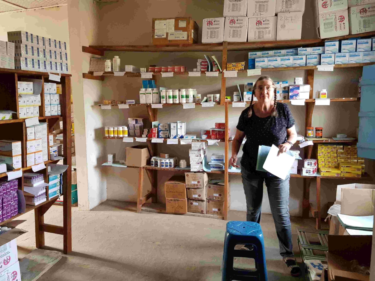 Andrea hat sich jetzt der Klinikapotheke angenommen – alle Medikamente sortiert – Ablaufdatum inspiziert und vieles in mühevoller Kleinarbeit sortiert und neu geordnet.