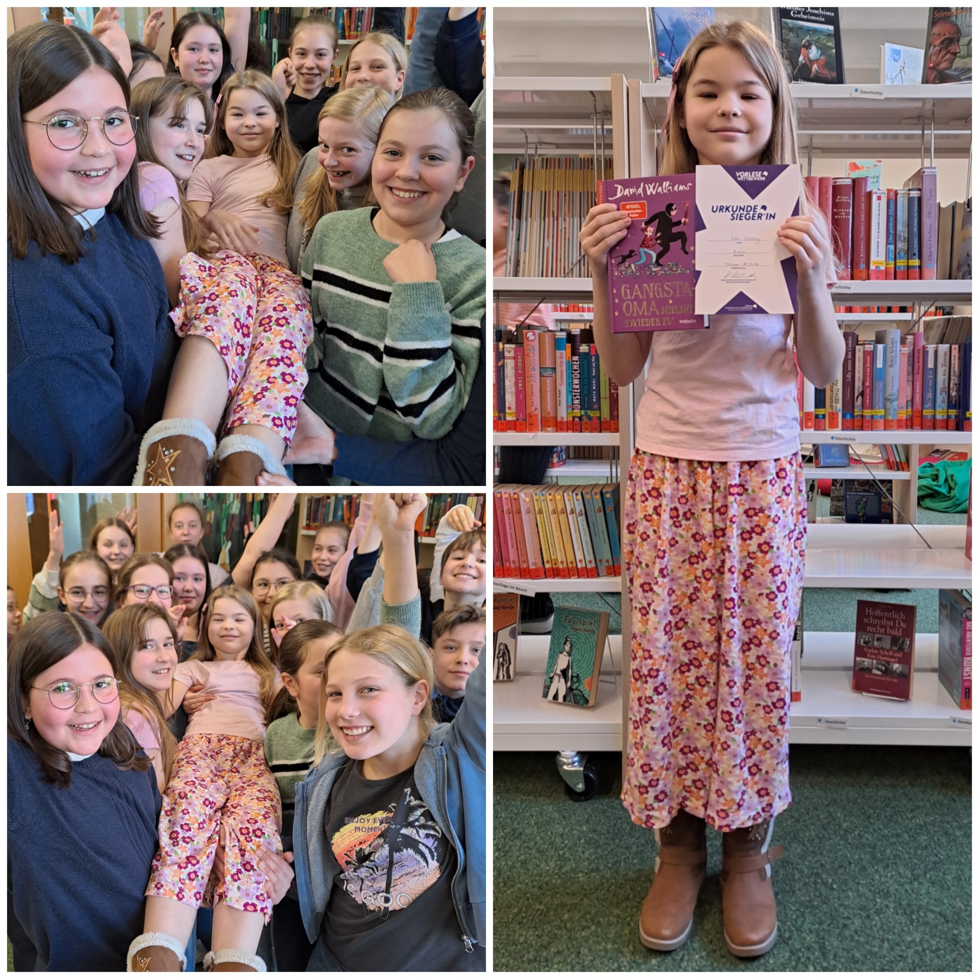 Nachdem Ida Göring im Oktober den Klassenwettbewerb gewonnen hatte und im November zur strahlenden Siegerin des Schulentscheids des Albertus-Gymnasiums gekürt worden war, konnte die talentierte Vorleserin im März auch im Kreisentscheid überzeugen. Bei Bücher Brenner in Dillingen, wo Ida als selbstgewählte Lektüre einen humorvollen Auszug aus David Walliams ,,Gangsta-Oma schlägt wieder zu“ vortrug, setzte sie sich tatsächlich gegen weitere elf Schulsiegerinnen aus dem Landkreis Dillingen durch. Herzlichen Glückwunsch, Ida, wir sind sehr stolz auf dich! Mitte April darf Ida nun im Bezirksentscheid Schwaben antreten, für den ihr die ganze Klasse schon jetzt die Daumen drückt.