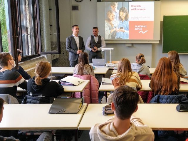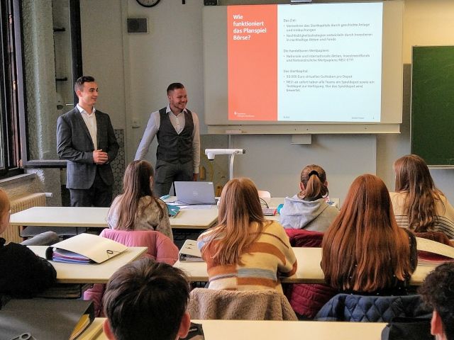 Anfang Oktober startete das Planspiel Börse, an dem die zehnte Jahrgangsstufe des Wirtschaftswissenschaftlichen Zweiges des Albertus-Gymnasiums geschlossen teilnimmt. Die Mitarbeiter der Sparkasse Dillingen-Nördlingen, Herr Sing und Herr Rembold, informierten die Schülerinnen und Schüler in einem kurzen Vortrag über die wichtigsten Regelungen bei diesem Planspiel. Zusätzlich gaben sie den Schülerinnen und Schülern noch hilfreiche Informationen zu den unterschiedlichen Geldanlageformen. Abschließend wünschten sie allen Spielgruppen viel Erfolg.