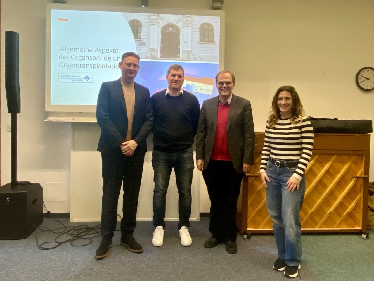 Personen v.l.n.r. Referent Dr. Florina Sommer, Patient Philipp Köhle, Schulleiter Jochen Schwarzmann, Organisatorin Stefanie Schwarz