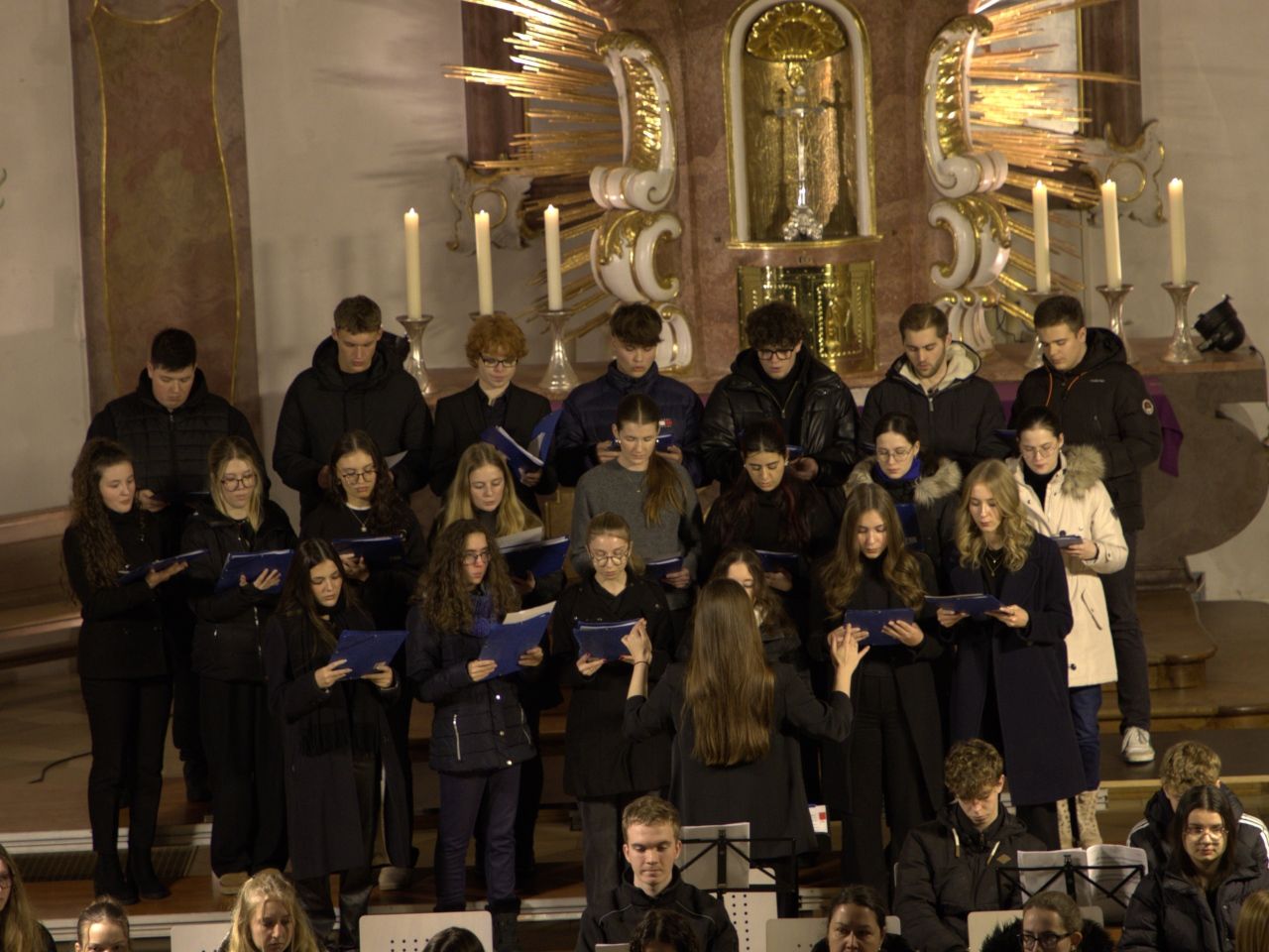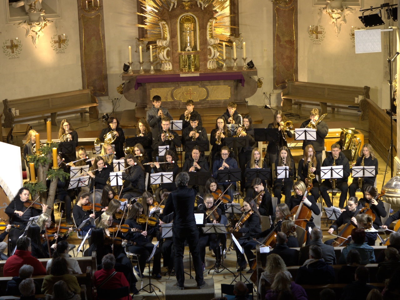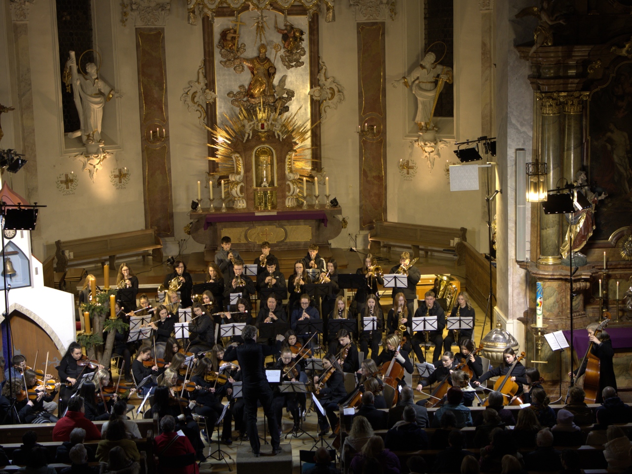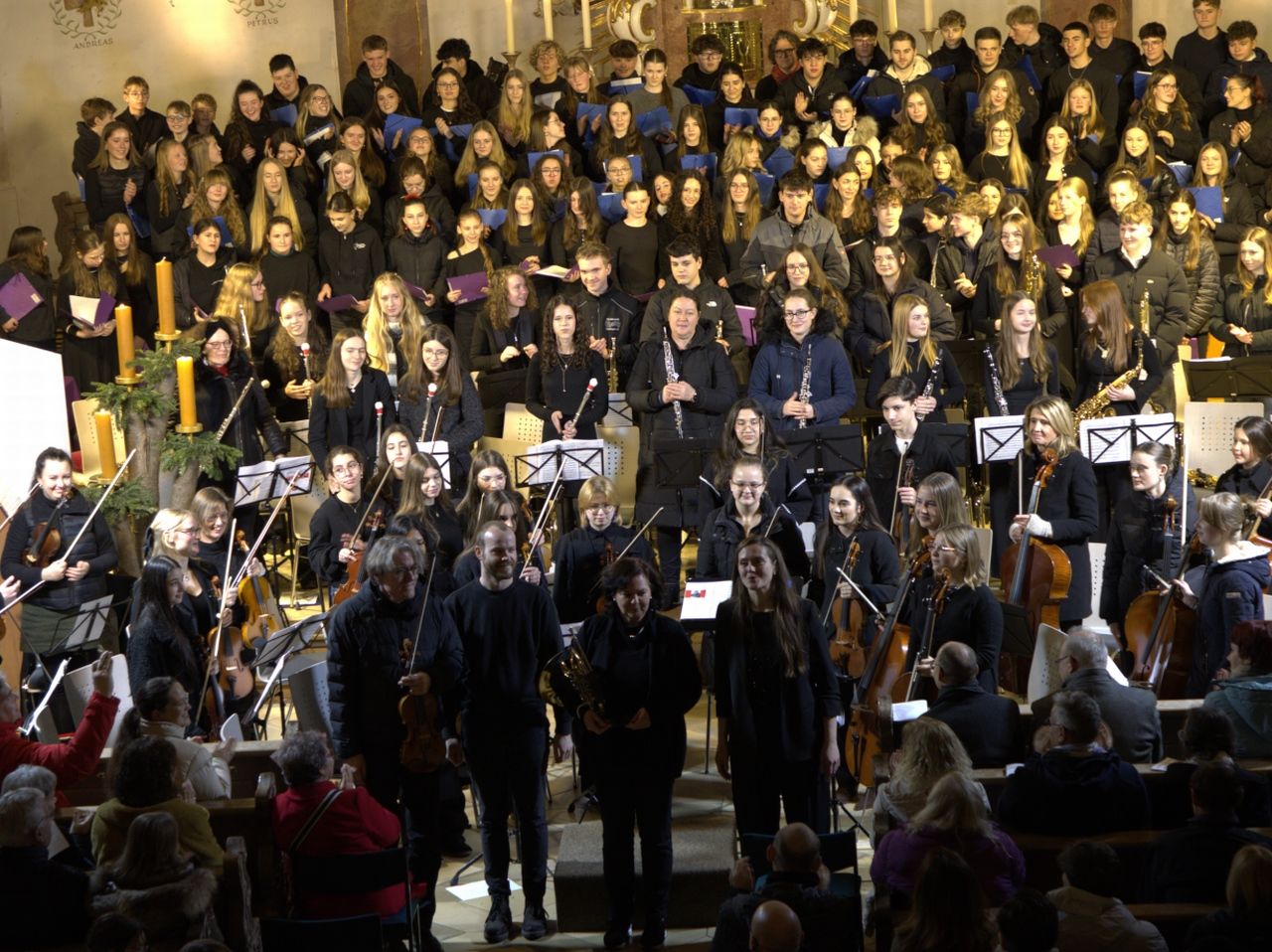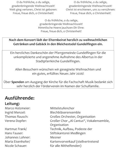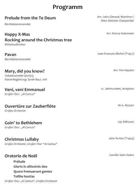 Mit Gesangssolisten (Vokalensemble Q12/Q13 G9), Mittelstufenchor (Marco Holzmeier), großem Chor (Verena Dopfer), Bläserquintett (Ingrid Menzel) und großem Orchester (Thomas Rausch) stimmten über 160 Mitwirkende musikalisch auf das Weihnachtsfest ein.