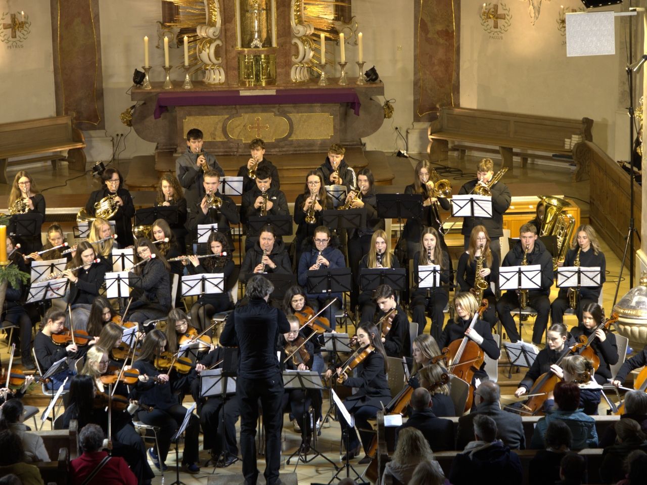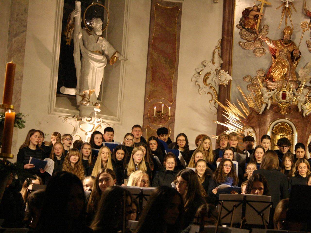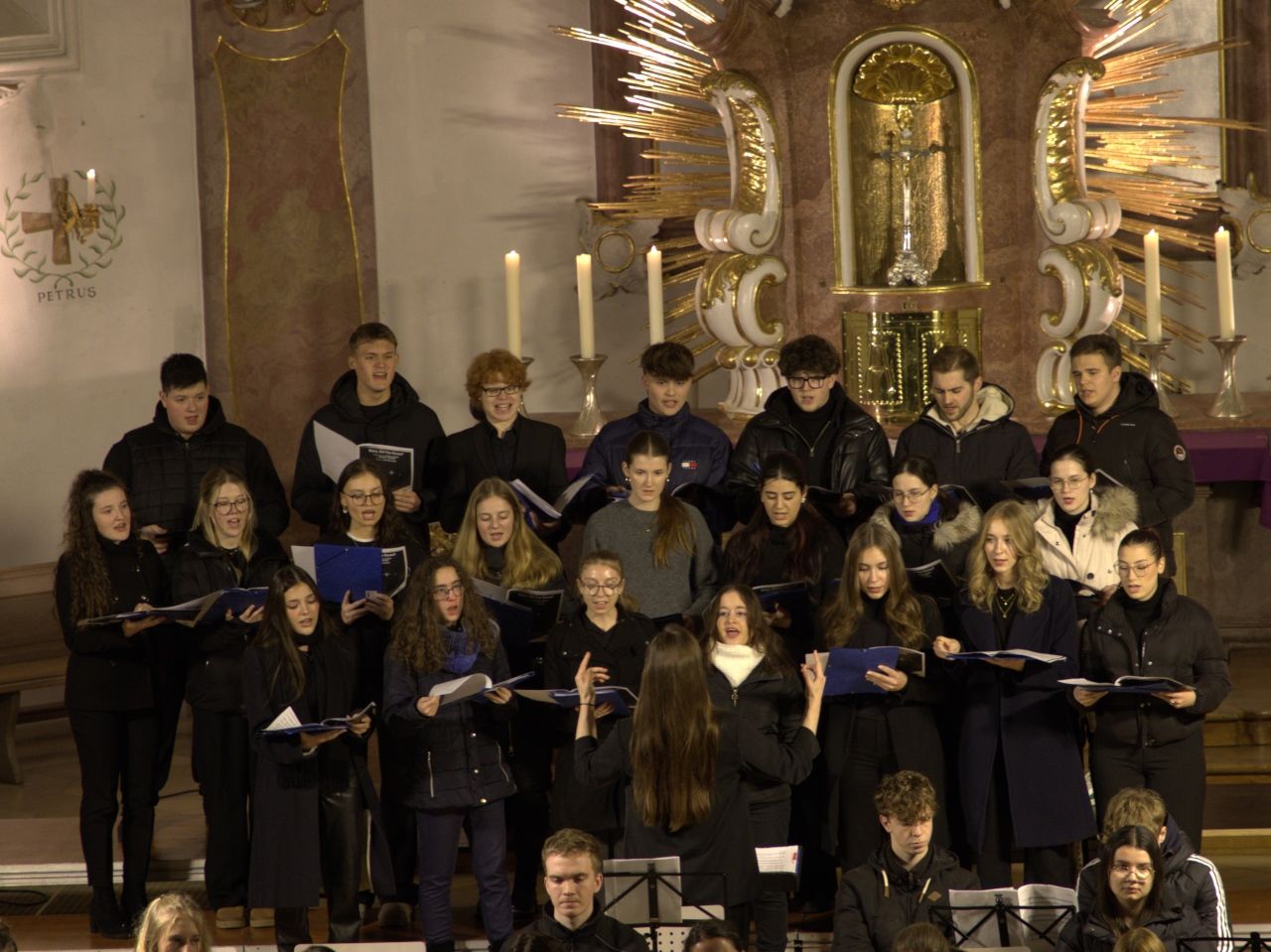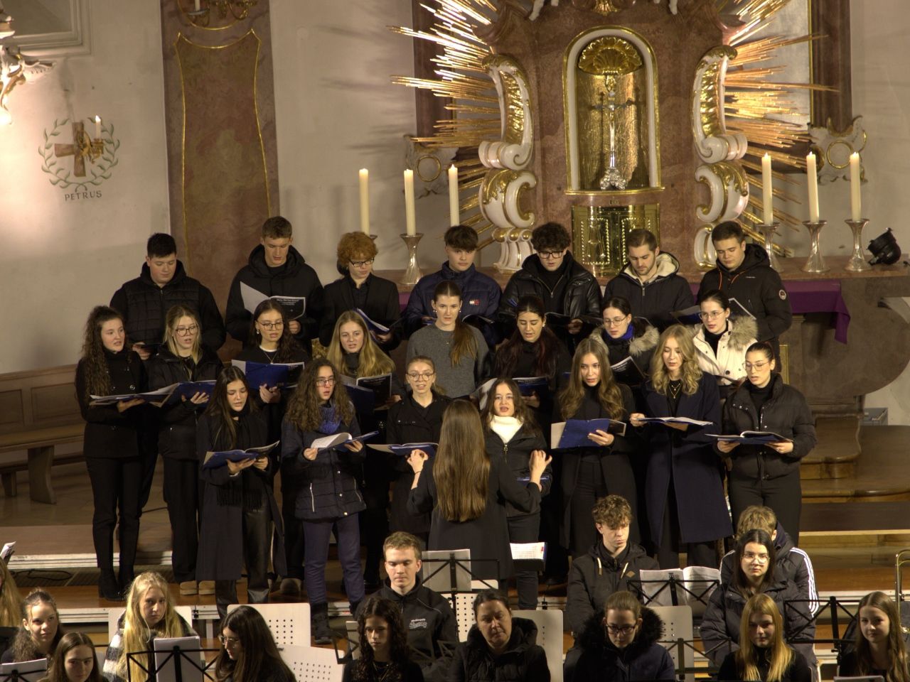 Mit Gesangssolisten (Vokalensemble Q12/Q13 G9), Mittelstufenchor (Marco Holzmeier), großem Chor (Verena Dopfer), Bläserquintett (Ingrid Menzel) und großem Orchester (Thomas Rausch) stimmten über 160 Mitwirkende musikalisch auf das Weihnachtsfest ein.
