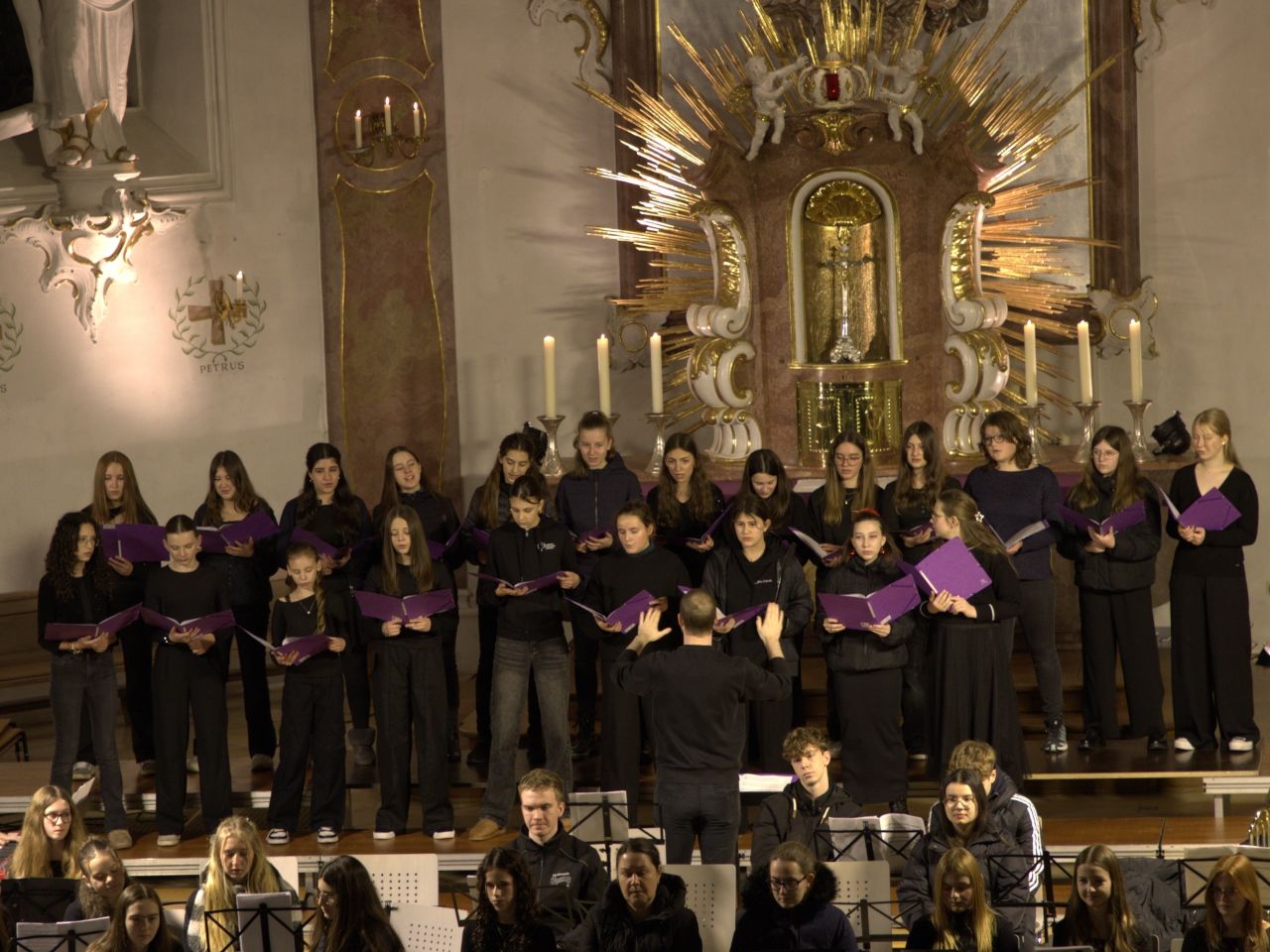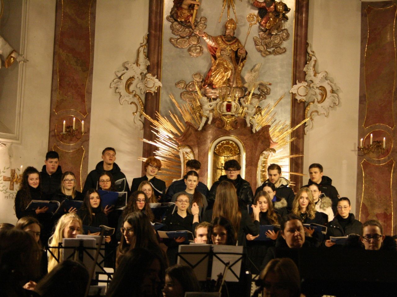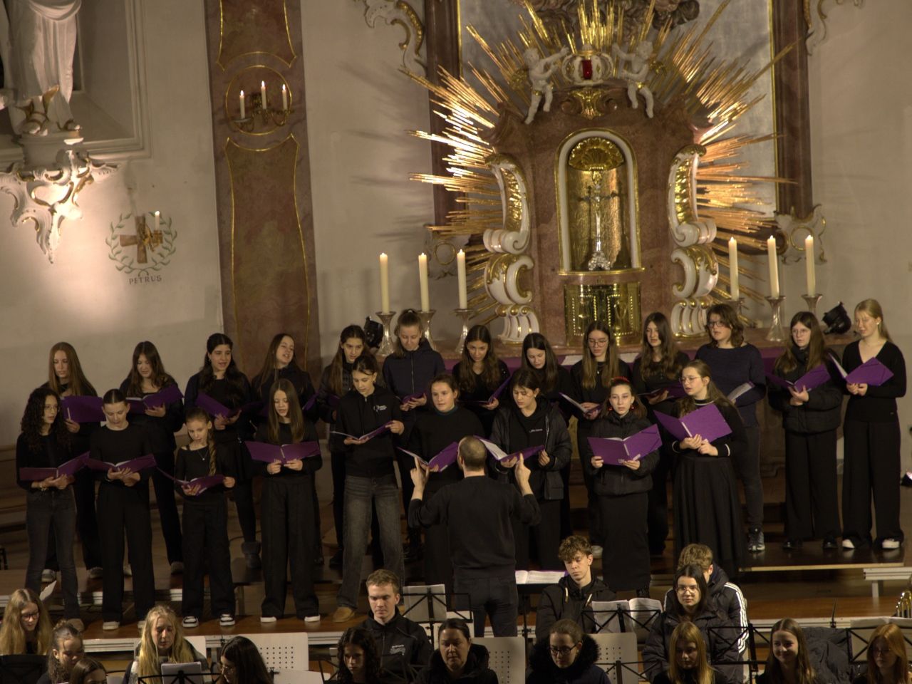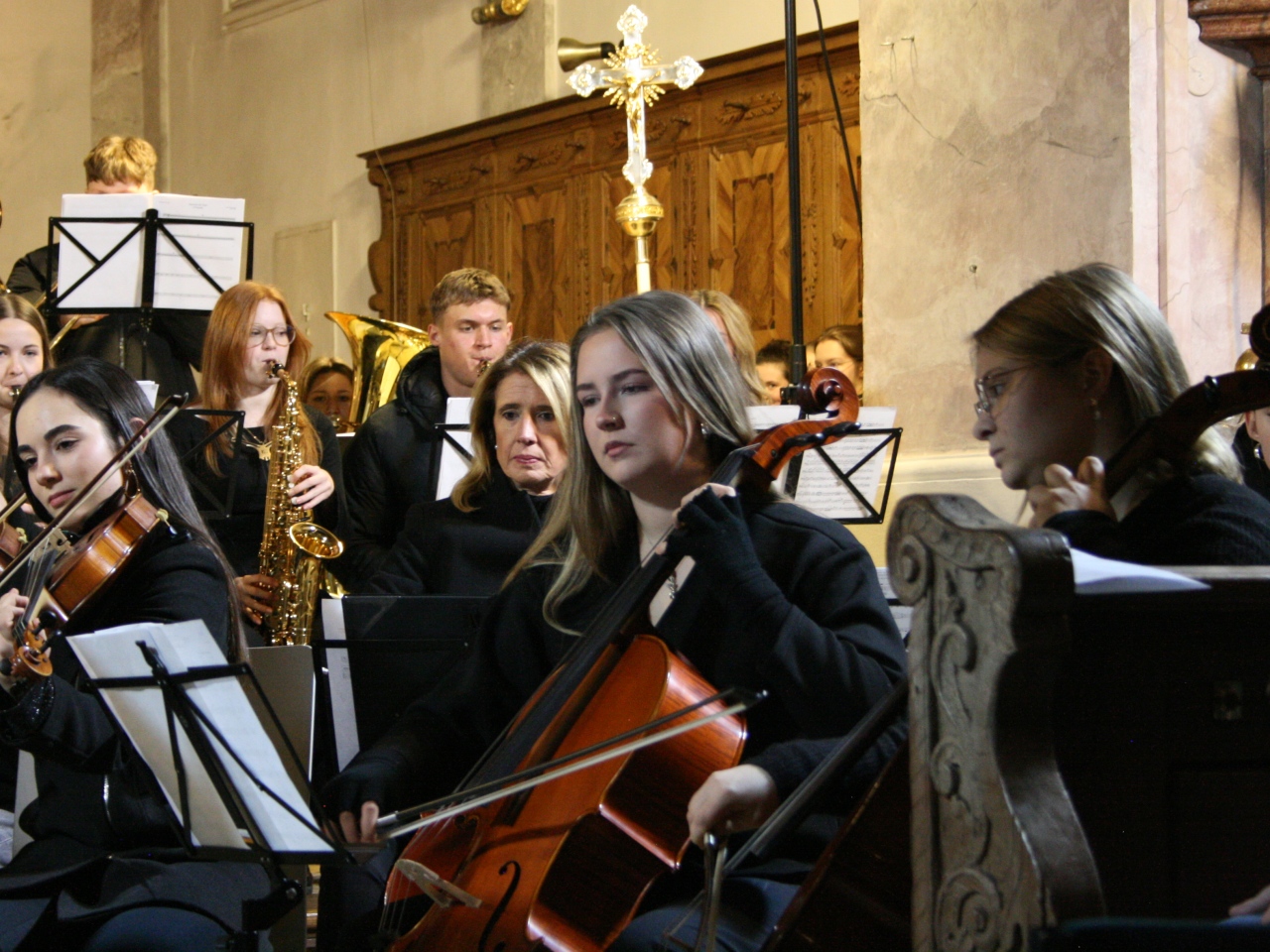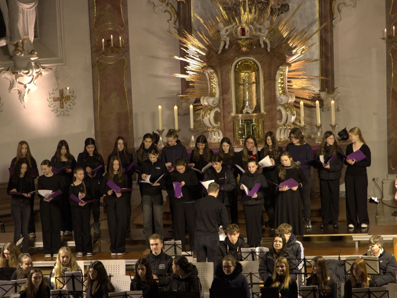 Mit Gesangssolisten (Vokalensemble Q12/Q13 G9), Mittelstufenchor (Marco Holzmeier), großem Chor (Verena Dopfer), Bläserquintett (Ingrid Menzel) und großem Orchester (Thomas Rausch) stimmten über 160 Mitwirkende musikalisch auf das Weihnachtsfest ein.