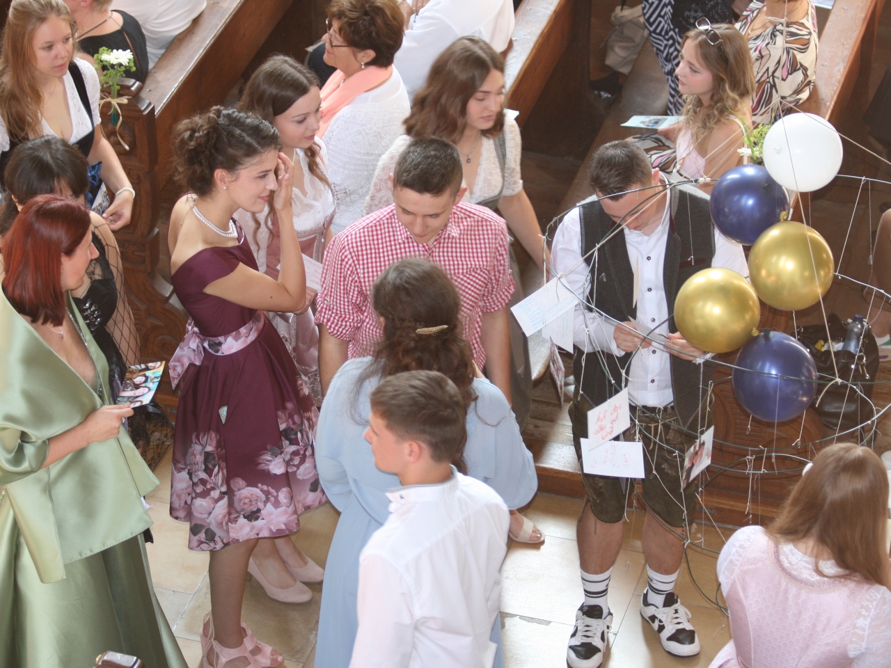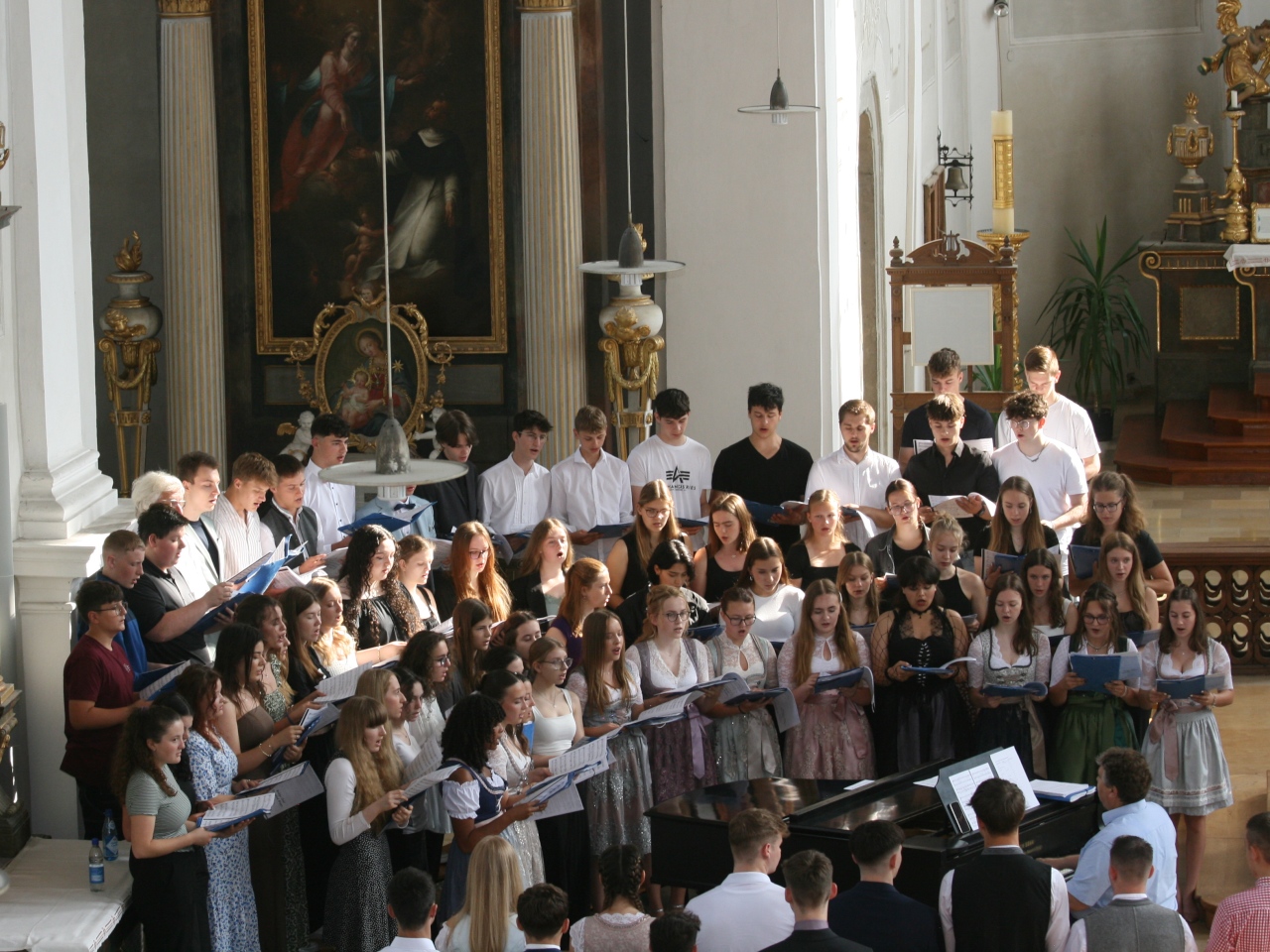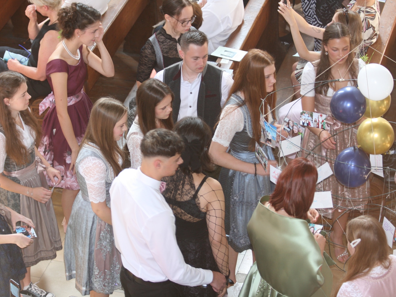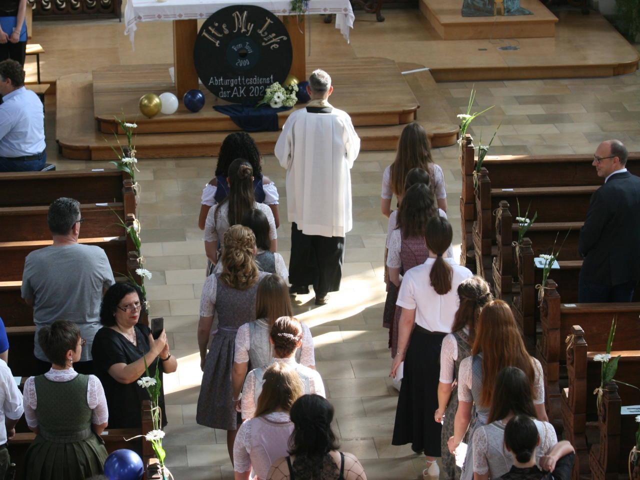 Feierlich begann der Morgen des 28.6.2024 mit dem Abiturgottesdienst in der Augustinerkirche, die von der verantwortlichen Schülergruppe liebevoll mit bunten Luftballons und Blumen dekoriert worden war. Unter dem Motto ,,It's my life'' blickten die frischgebackenen Abiturienten dort zufrieden und dankbar auf ihre Schulzeit zurück und formulierten gemeinsam Hoffnungen und Wünsche für ihren weiteren Lebensweg. Pfarrer Raffaele de Blasi, der den Gottesdienst leitete, erinnerte in seiner Predigt zu einer Passage aus dem Schöpfungsbericht an die sinnstiftende Bedeutung des Glaubens. Besonders festlich wirkte die Stimmung durch die beeindruckenden Beiträge des Großen Chors, den Klaus Nürnberger auf dem Keyboard begleitete. Allerdings wurde der Mottosong ,,It's my life'' nicht nur musikalisch dargeboten, sondern - wie es sich für Gymnasiasten gehört - auch interpretiert: ,,Dieser Titel ist nicht nur der Name eines bekannten Lieds von Bon Jovi, sondern auch eine Aussage, die unsere Haltung und unsere Hoffnung ausdrückt", erklärten Adrienne Kaiser und Tobias Hihler in ihrer tiefgründigen Ansprache, ,,wir wollen unser Leben selbst in die Hand nehmen, unsere Talente und Fähigkeiten entfalten, unsere Träume und Wünsche verwirklichen. Wir wollen unser Leben mit Sinn und Freude erfüllen, mit Liebe und Respekt für uns selbst und für andere, es als Geschenk Gottes annehmen und ihm danken, dass er uns begleitet und beschützt."