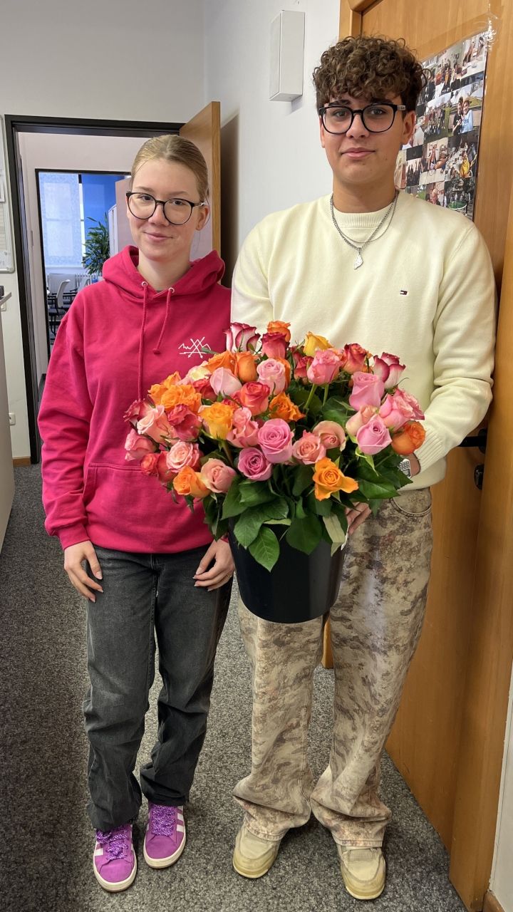 Heute war es endlich so weit: Während des Unterrichts gingen die SMV-Mitglieder von Klasse zu Klasse und verteilten die farbprächtigen Rosen. Es herrschte eine gespannte und fröhliche Stimmung – überall sah man überraschte und glückliche Gesichter.